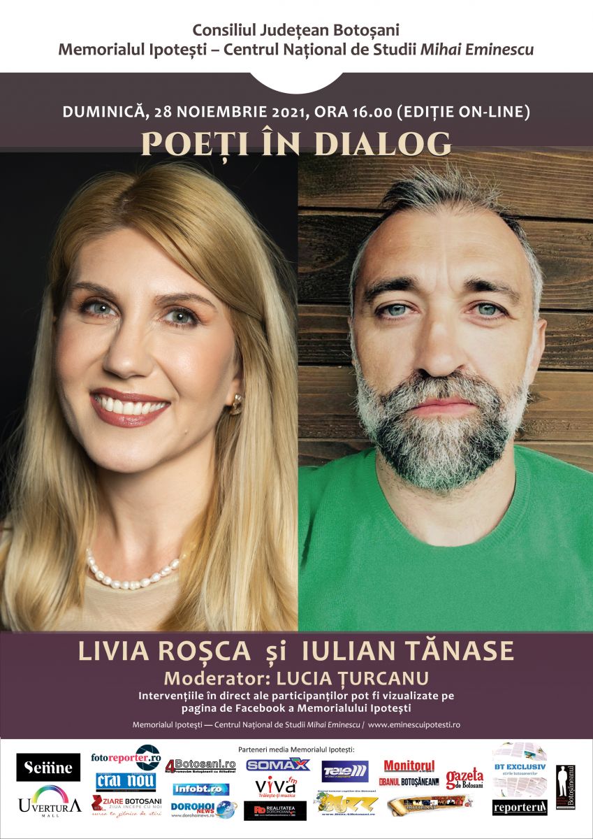 Pe data de 28 noiembrie 2021, la ora 16.00, va avea loc ediția din noiembrie a lecturilor Poeți în dialog. Invitații Memorialului Ipotești – Centrul Național de Studii „Mihai Eminescu” sunt Livia Roșca și Iulian Tănase. Discuția va fi moderată de Lucia Țurcanu.