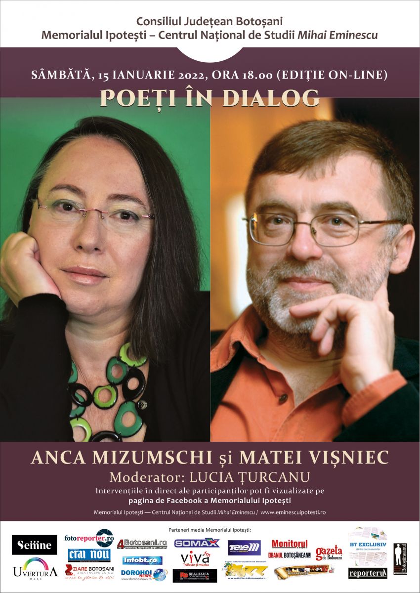 Pe data de 15 ianuarie 2022, la ora 18.00, în cadrul Zilelor Eminescu, Memorialul Ipotești – Centrul Național de Studii „Mihai Eminescu” organizează o nouă ediție a întâlnirilor Poeți în dialog.