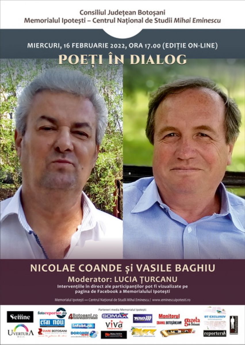 Pe data de 16 februarie 2022, la ora 17.00, Memorialul Ipotești – Centrul Național de Studii „Mihai Eminescu” organizează o nouă ediție a întâlnirilor Poeți în dialog.