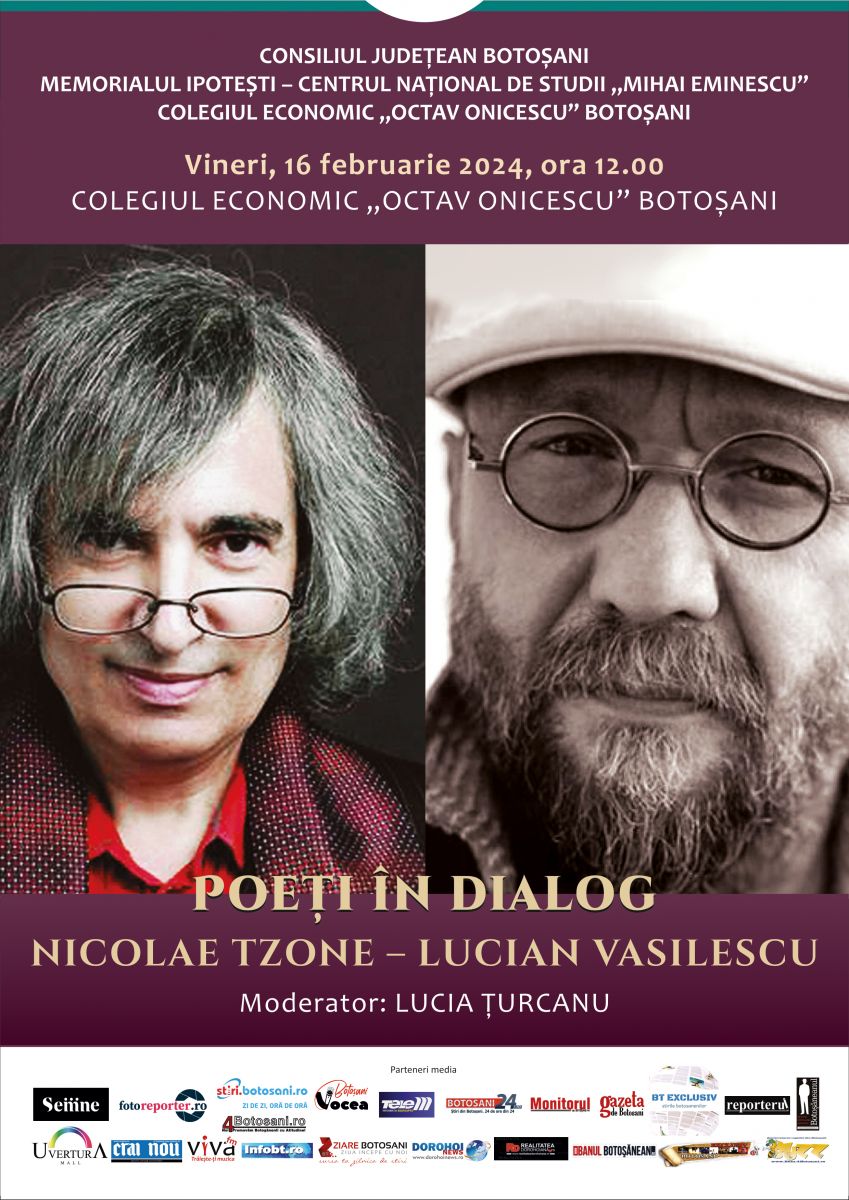 Vineri, 16 februarie 2024, începând cu ora 12.00, la Colegiul Economic „Octav Onicescu” din Botoșani vor avea loc lecturi publice și discuții cu poeții Nicolae Tzone și Lucian Vasilescu. Evenimentul va fi moderat de Lucia Țurcanu.