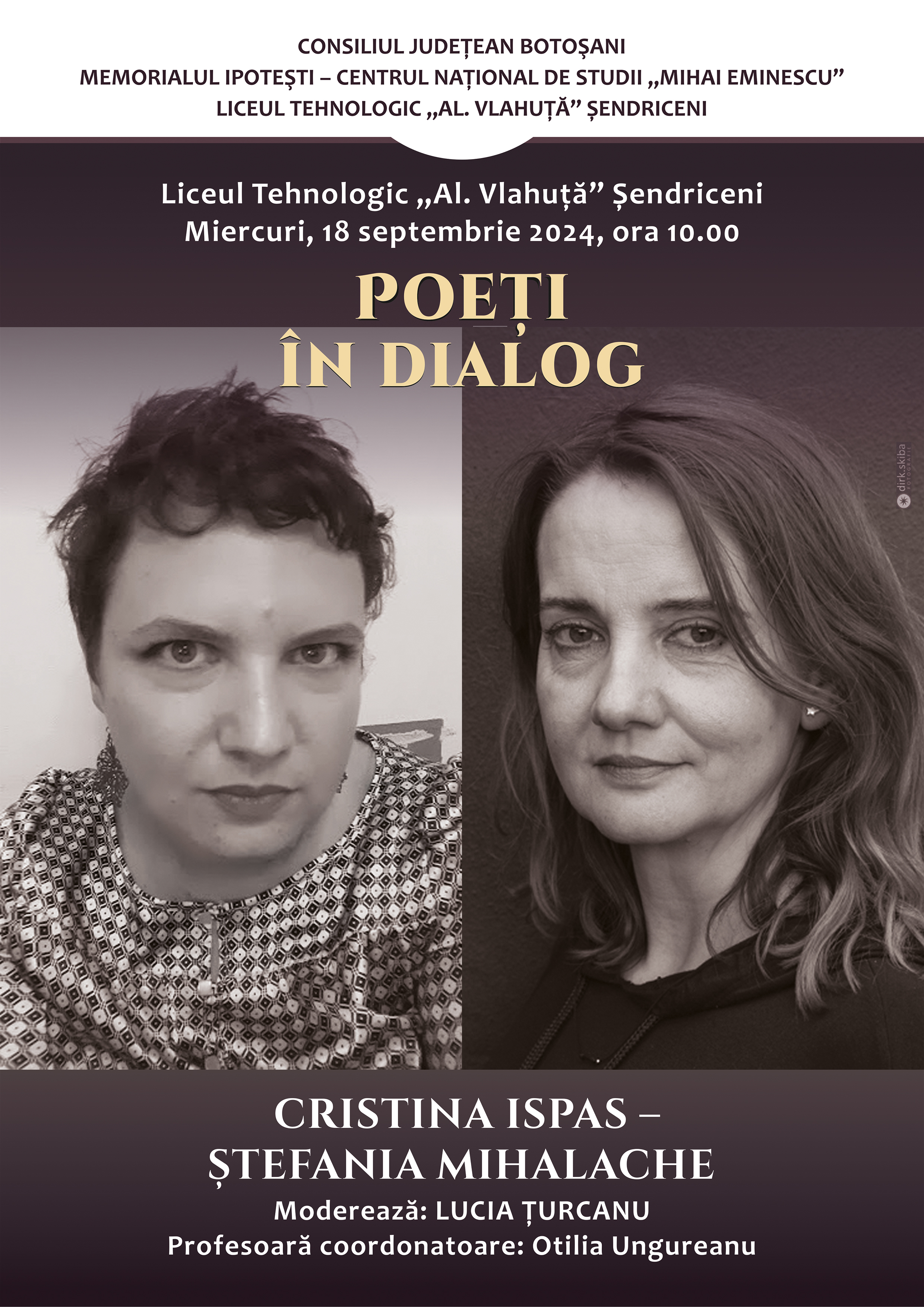Întâlnirea va avea loc, începând cu ora 10:00, la Liceul Tehnologic „Al. Vlahuță” Șendriceni și va fi moderată de Lucia Țurcanu; profesoară coordonatoare – Otilia Ungureanu.