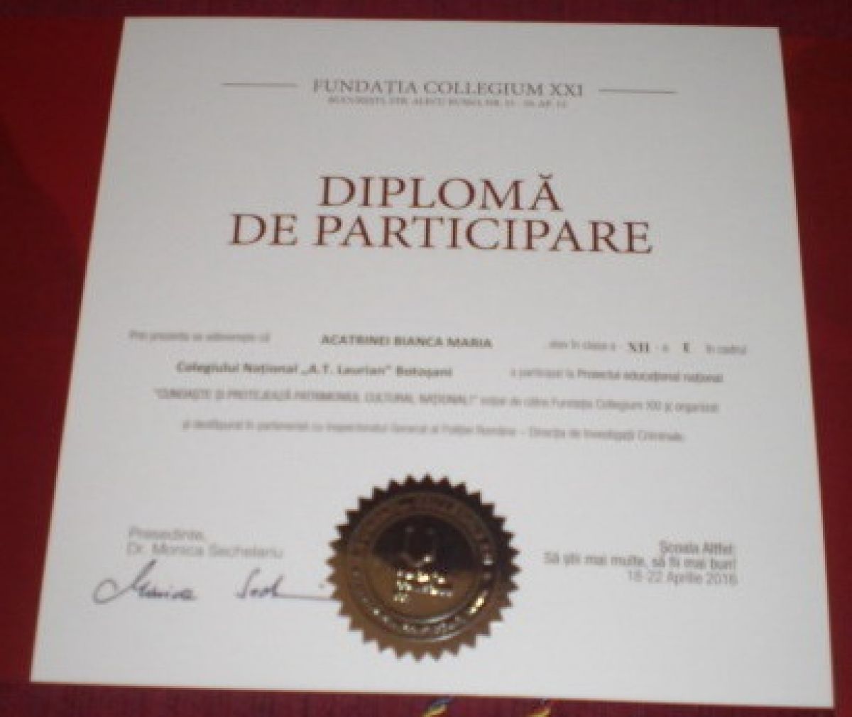 În săptămâna 18-24 aprilie 2016, Inspectoratul General al Poliţiei Române – Direcţia de Investigaţii Criminale, în parteneriat cu Fundaţia „Collegium XXI”, a desfăşurat proiectul educaţional naţional „Cunoaște și protejează patrimoniul cultural național”.