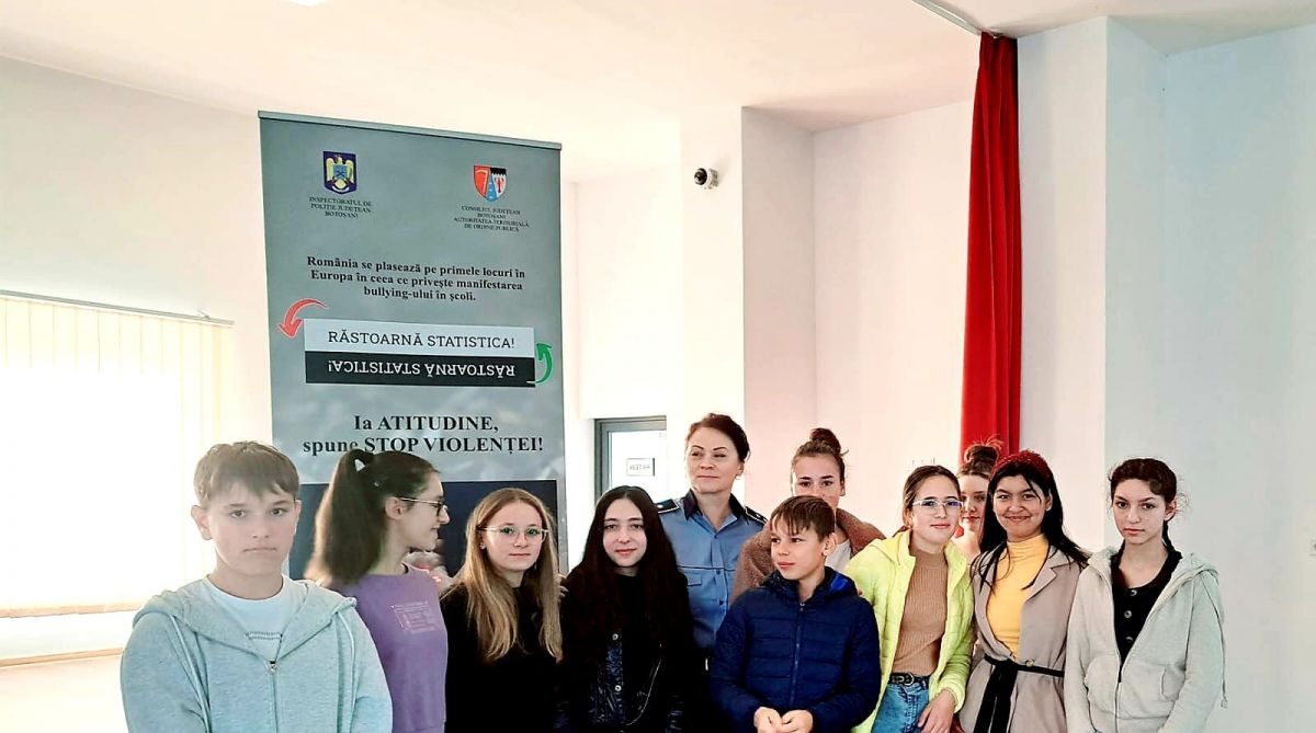 În această săptămână, 28 octombrie - 4 noiembrie, polițiștii Biroului Siguranța Școlară, împreună cu polițiștii rutieri au desfășurat activități de educație rutieră și prevenire a bullying-ului și a consumului de droguri, cu elevii școlilor gimnaziale din localitățile Darabani, Săveni, Cristești, Corni și Roma.