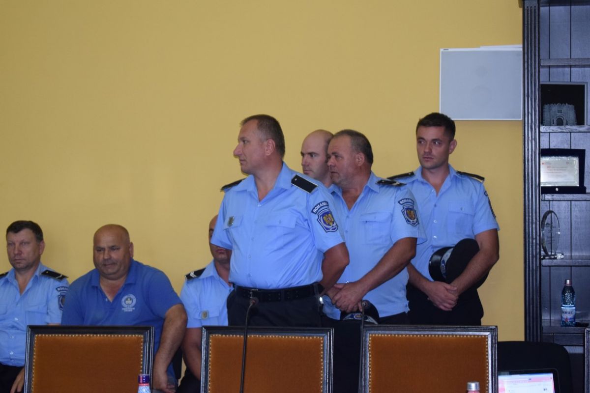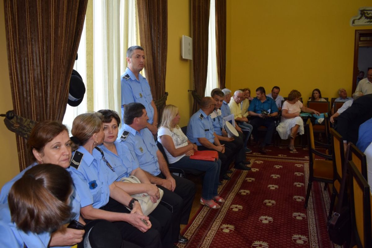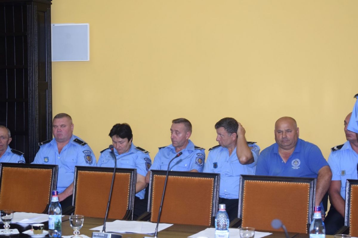 Polițiștii locali se află pe scaune, în picioare sau pe holuri, unii aflându-se chiar în spatele primarului care stă încruntat pe locul obișnuit.