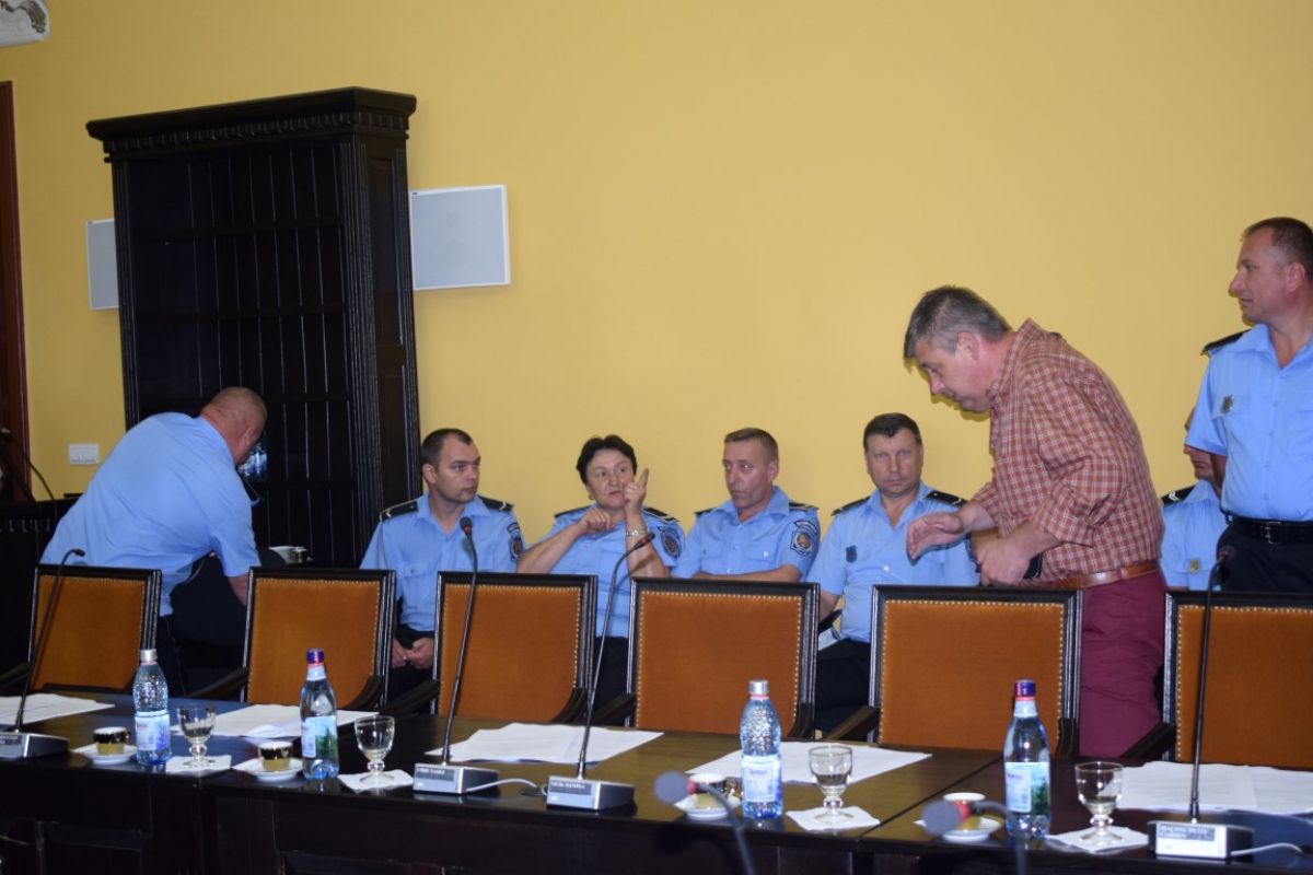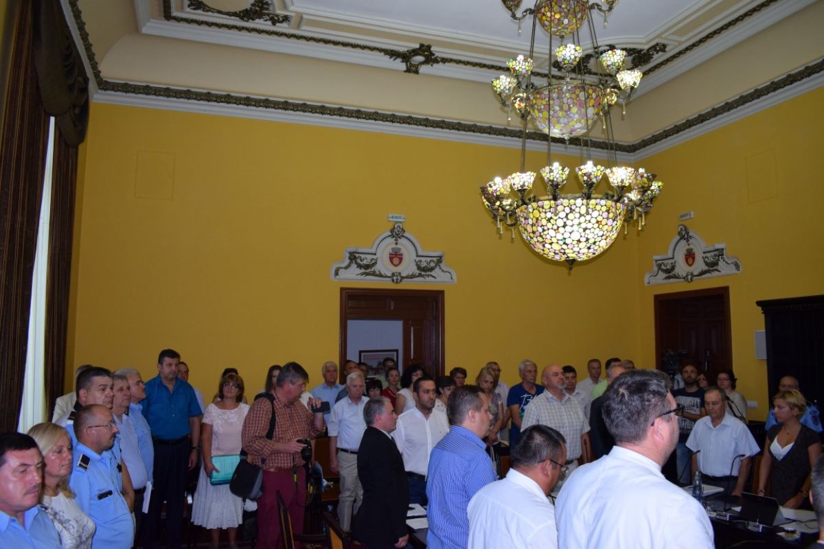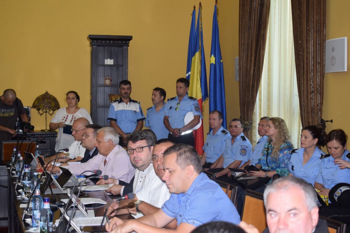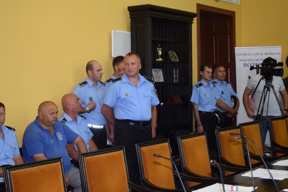 Polițiștii locali se află pe scaune, în picioare sau pe holuri, unii aflându-se chiar în spatele primarului care stă încruntat pe locul obișnuit.