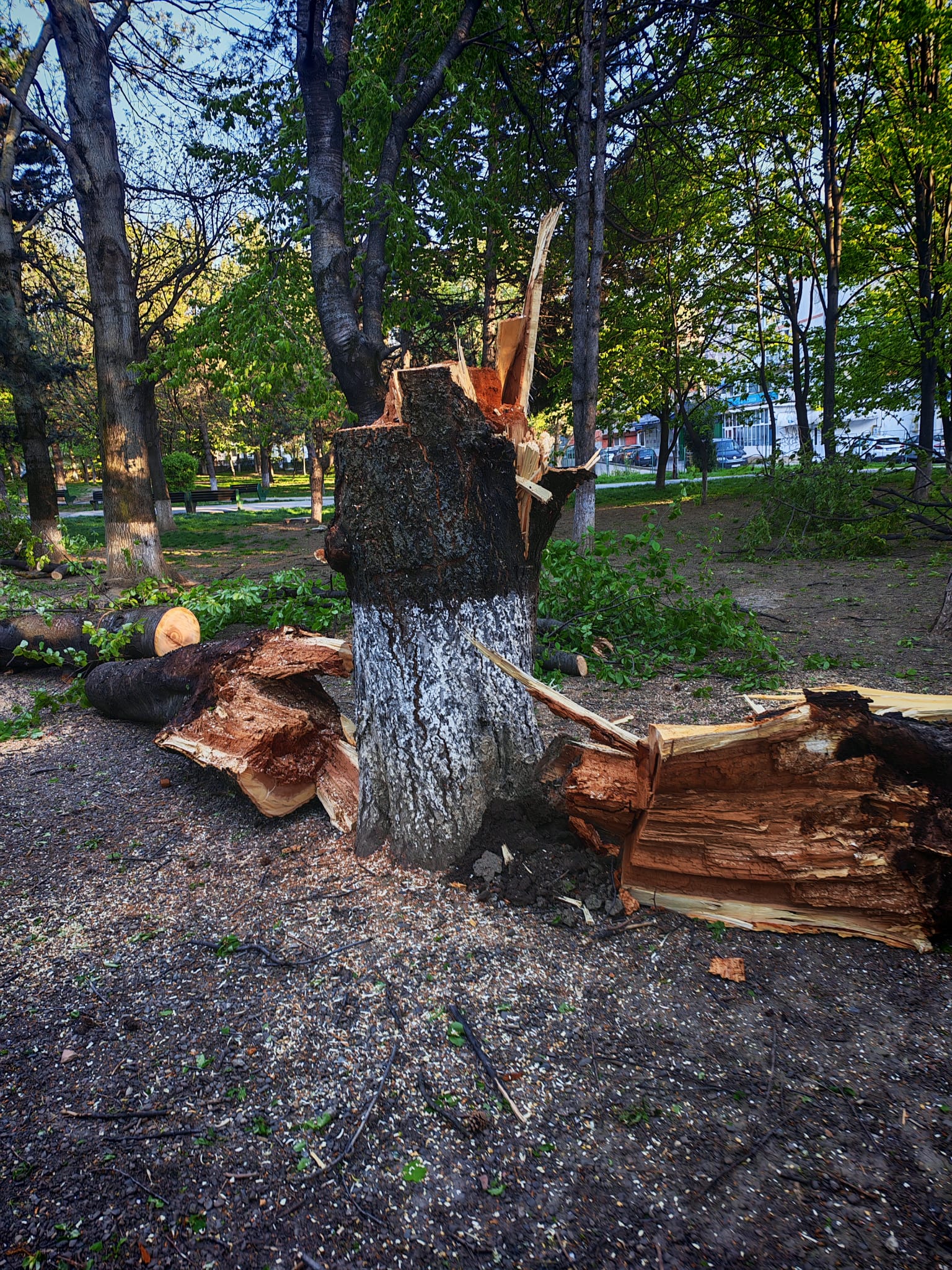 Pompierii botoșăneni au intervenit, în urmă cu puțin timp, în Parcul Curcubeului din municipiul Botoșani, unde un arbore prezenta pericol iminent de prăbușire. Trunchiul acestuia era grav afectat, existând riscul să cadă în orice moment peste trecători.