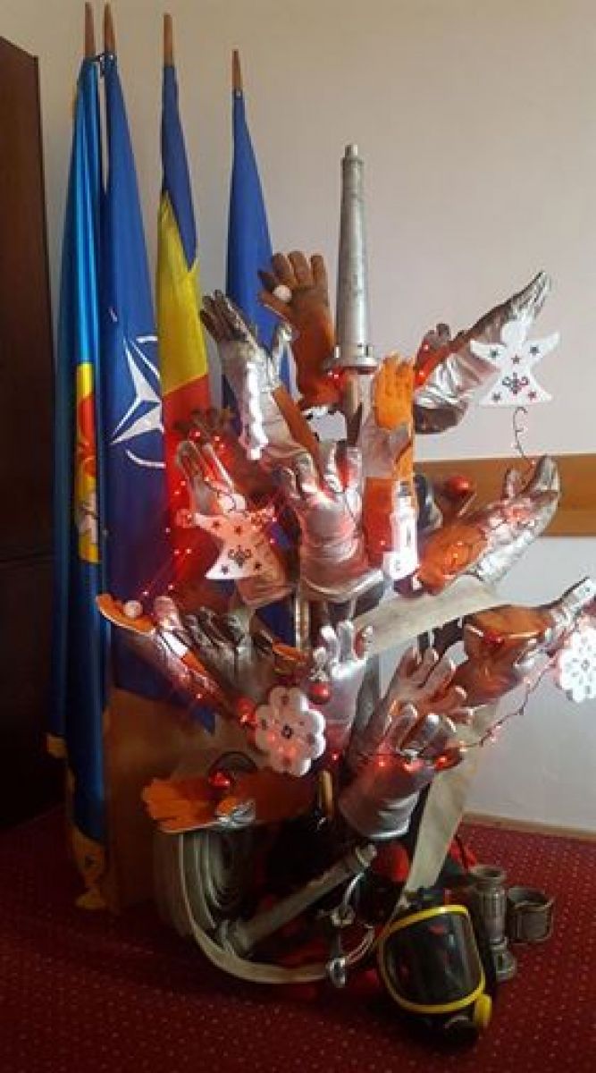 Purtate de salvatorii botosaneni pe timpul misiunilor de salvare a vietii si bunurilor materiale, mănușile de protectie alcatuiesc unul dintre cei mai originali brazi de Craciun. Pe langa simbolul speranței si al vietii veșnice, pomul de Craciun al pompierilor botosaneni este "incarcat" cu emotia a sute de povesti ale oamenilor aflati in situatii limita.