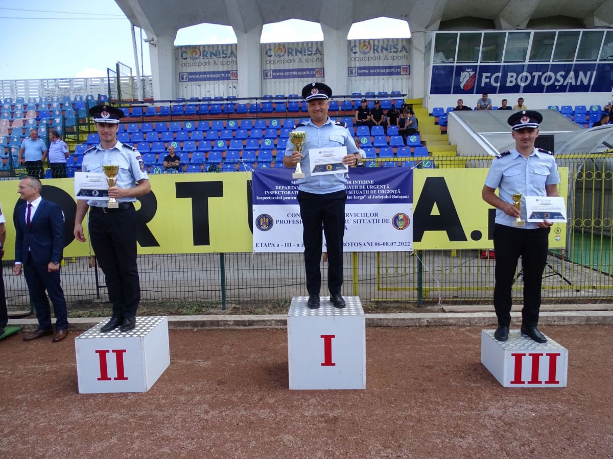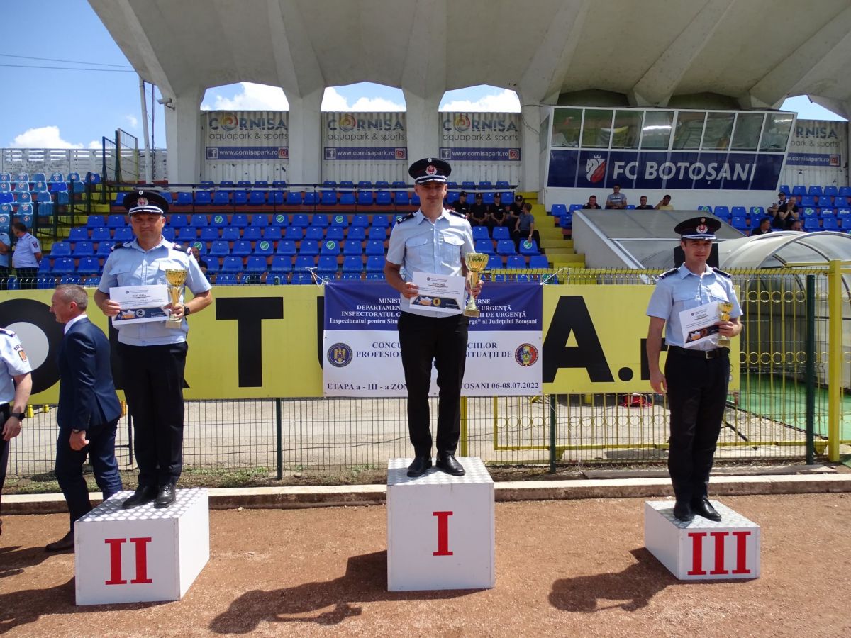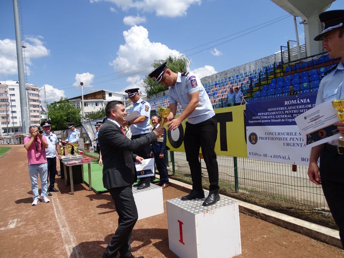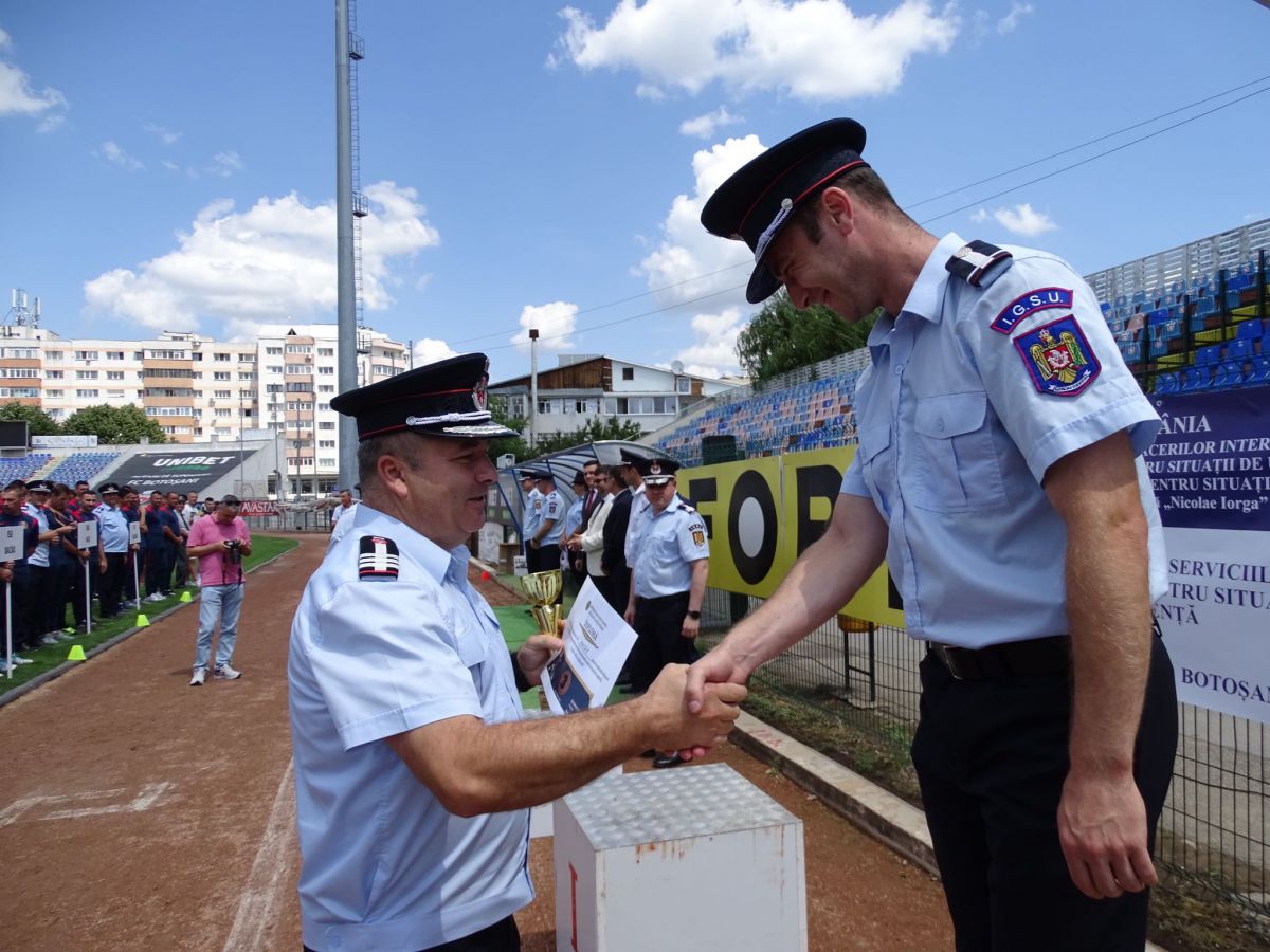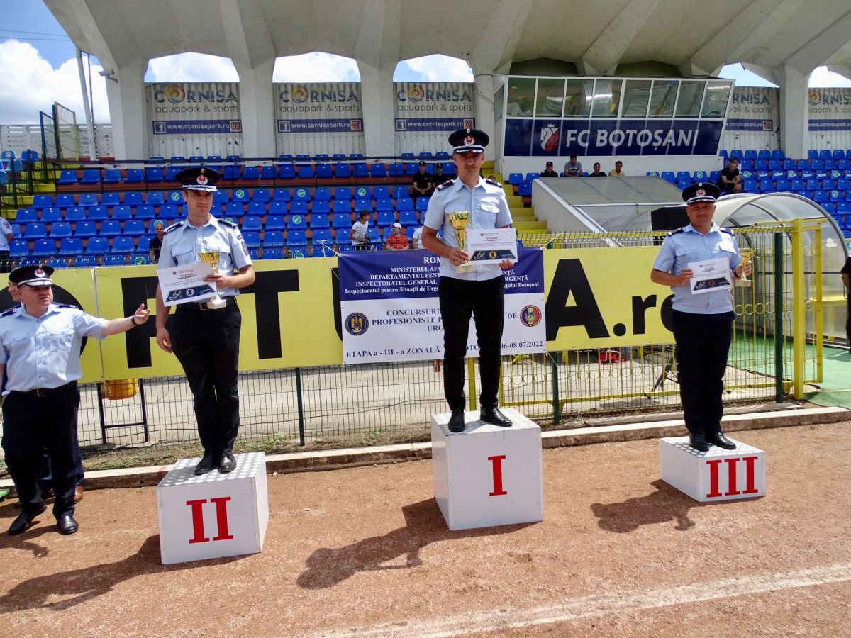 Concurenții au fost felicitați pentru rezultatele obținute în cadrul unei festivități de premiere, la care au participat prefectul județului Botoșani, Sorin Cornilă, inspectorii șefi ai Inspectoratelor pentru Situații de Urgență Iași, Bacău, Suceava, Neamț și Botoșani, dar și șefii structurilor Ministerului Afacerilor Interne din județ.