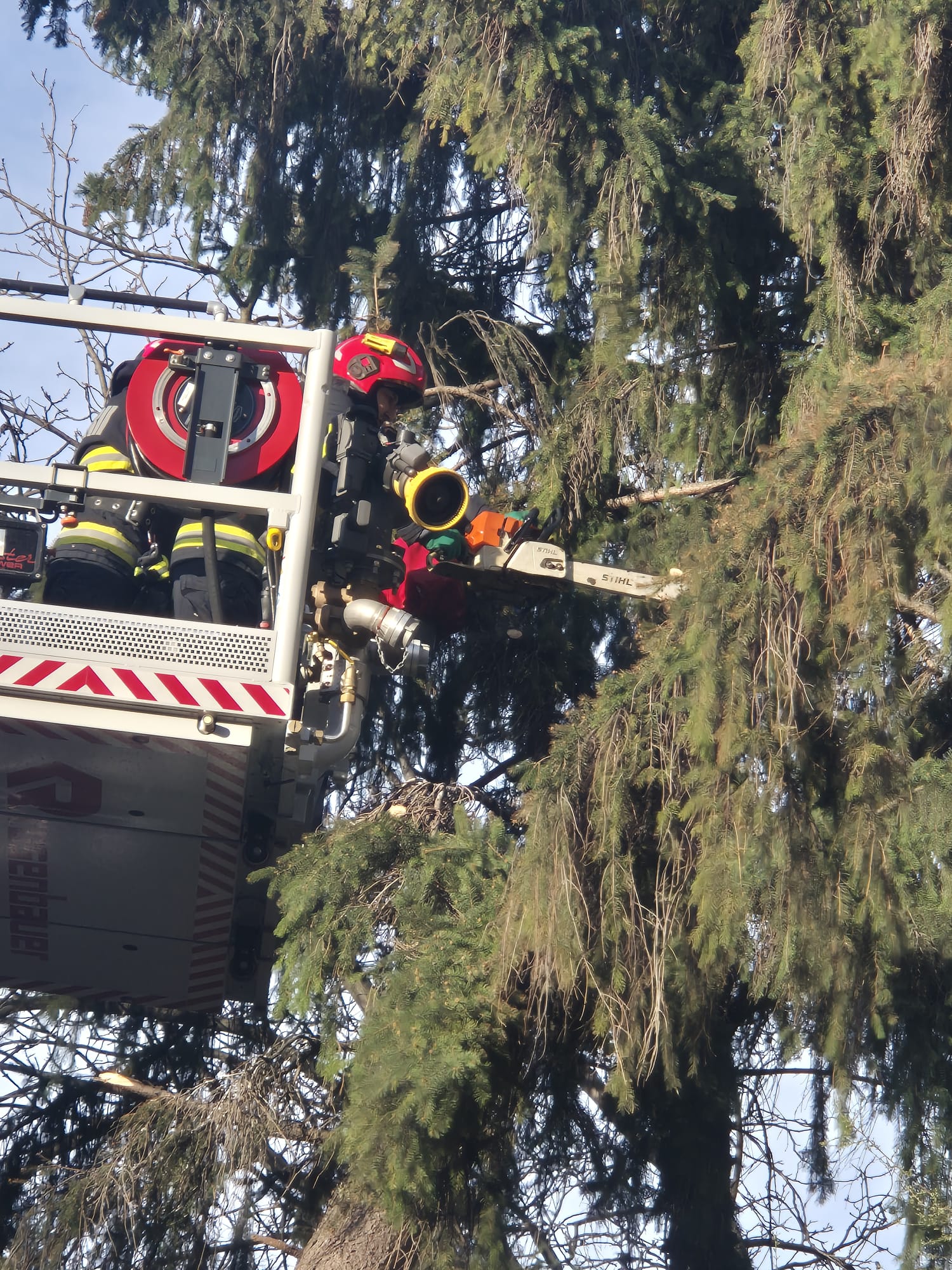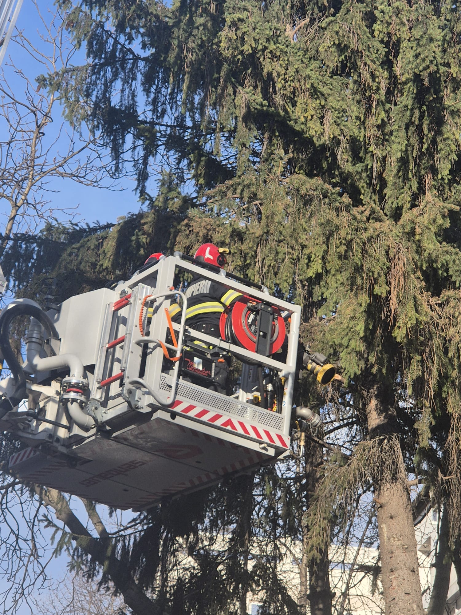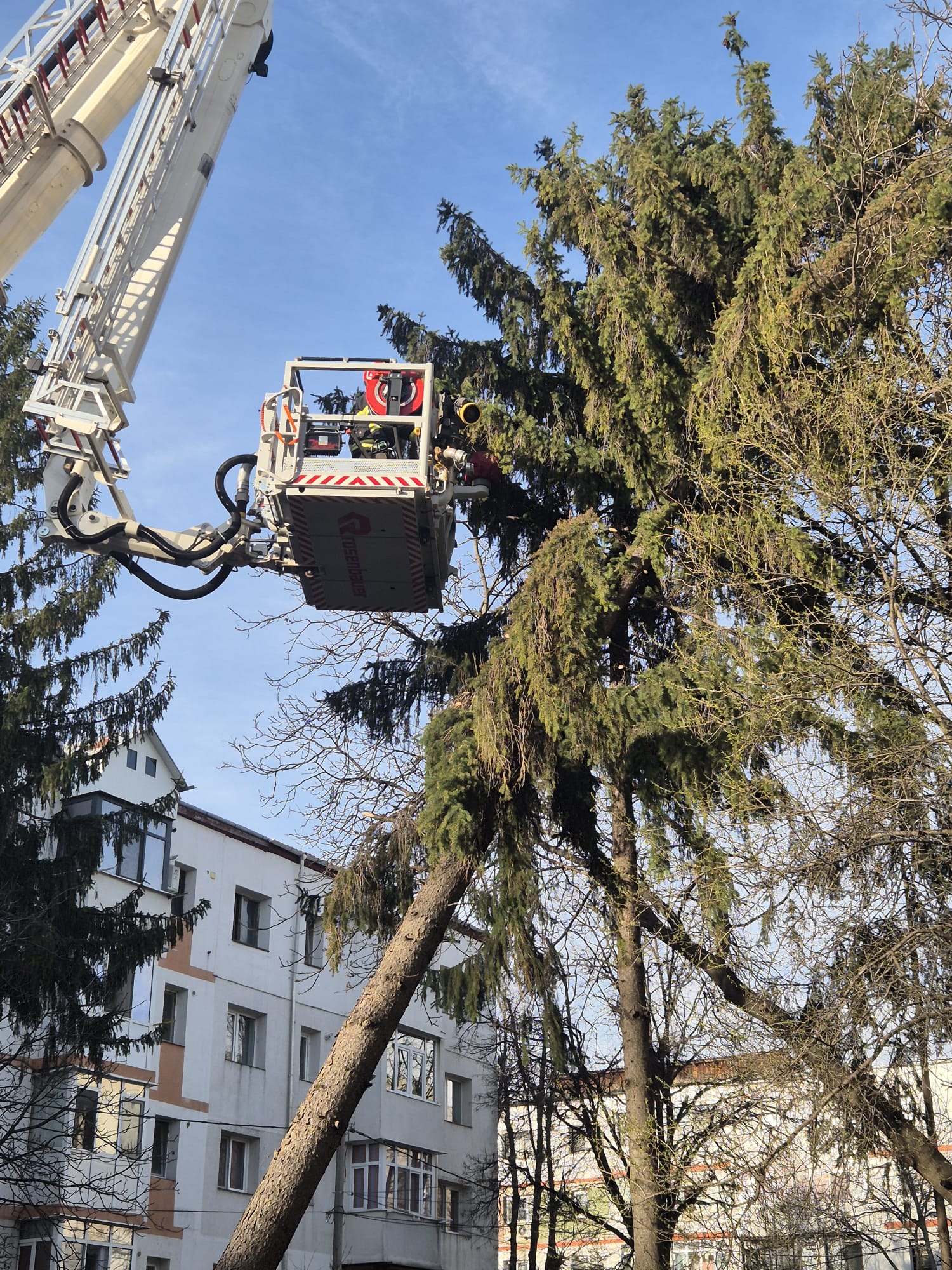 - pe strada Aleea Scurtă din municipiul Botoșani, unde un arbore putea să cadă oricând peste mașinile parcate în zonă. După ce proprietarii autoturismelor au eliberat parcarea, pompierii de la Detașamentul Botoșani au tăiat arborele, bucată cu bucată, cu ajutorul accesoriilor specifice;