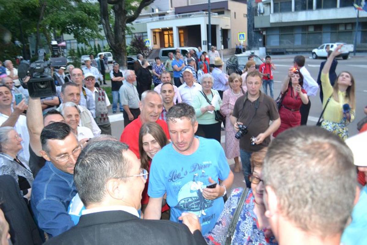 A discutat cu simpatizanții partidului cărora le-a transmis să iasă la vot și, evident să pună ștampila pe candidații PSD, s-a fotografiat cu competitorii acestei formațiuni, a susținut o conferință de presă. Oamenii care l-au întâmpinat după emisiunea electorală televizată l-au așteptat răbdători și la ieșirea din sediul de partid. L-au aplaudat frenetic și i-au strigat cuvinte de încurajare. Victor Ponta s-a oprit pentru a vorbi cu o fetiță după care, flancat de PSD-iștii botoșăneni s-a urcat într-un microbuz care a plecat spre Bucecea. După un eveniment electoral în micul oraș pentru susținerea candidatului Andron Țimpău, Victor Ponta va pleca spre Suceava. (G.E.)