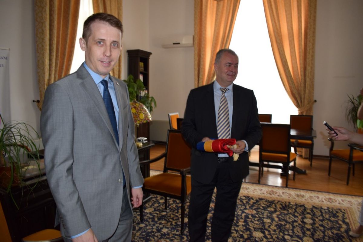 Ulterior, au fost invitați și jurnaliștii pentru predarea în mod simbolic a mandatului. Ovidiu Portariuc i-a oferit cocarda lui Cătălin Flutur și i-a transmis: ”Domn primar vă ofer cocarda, vă rog frumos să aveți grijă de oraș. V-am lăsat pe birou și o parte dintre proiectele începute în mandatul meu”.