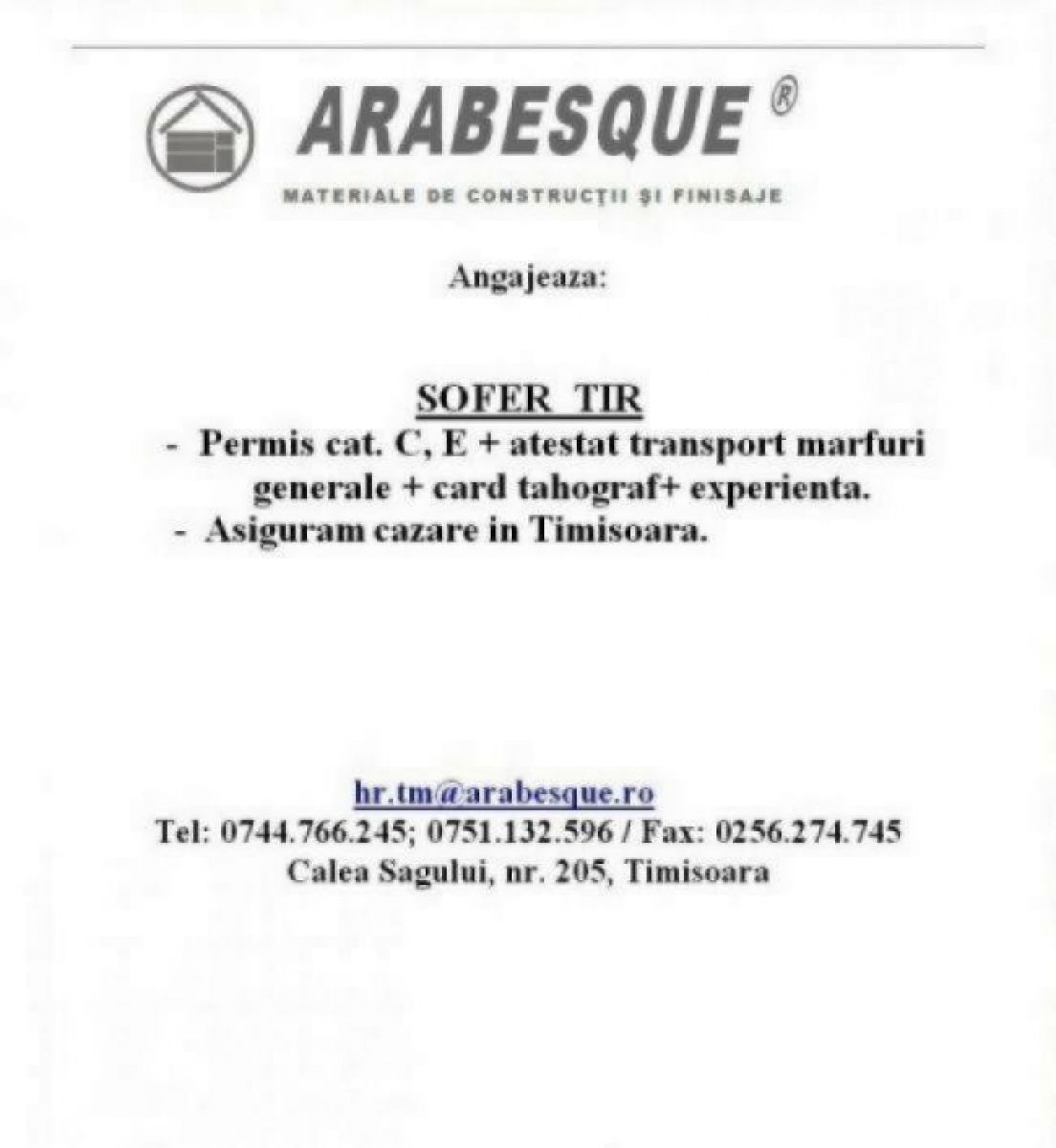 Cei interesaţi trebuie să deţină permis categoriile C, E + atestat transport mărfuri generale. Compania asigură cazare gratuită în Timişoara.
