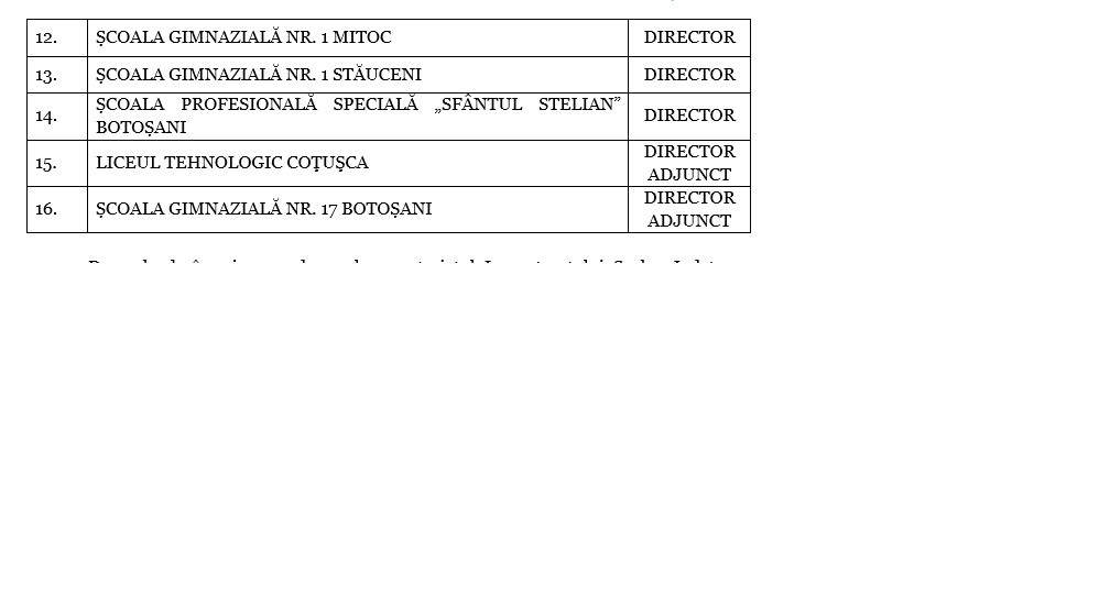 Cele 16 funcții de conducere, care devin vacante după încetarea Contractelor de management ale directorilor care au fost numiți urmare a promovării concursului din aprilie 2022, sunt următoarele: