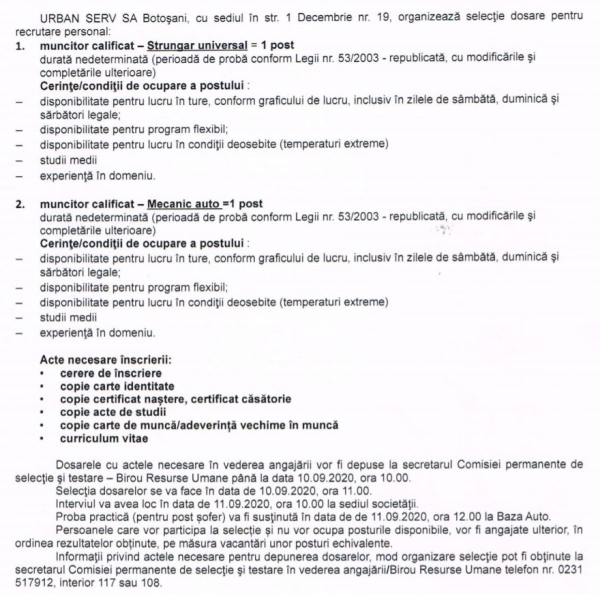 Urban Serv SA Botoșani organizează selecție dosare pentru recrutare personal.