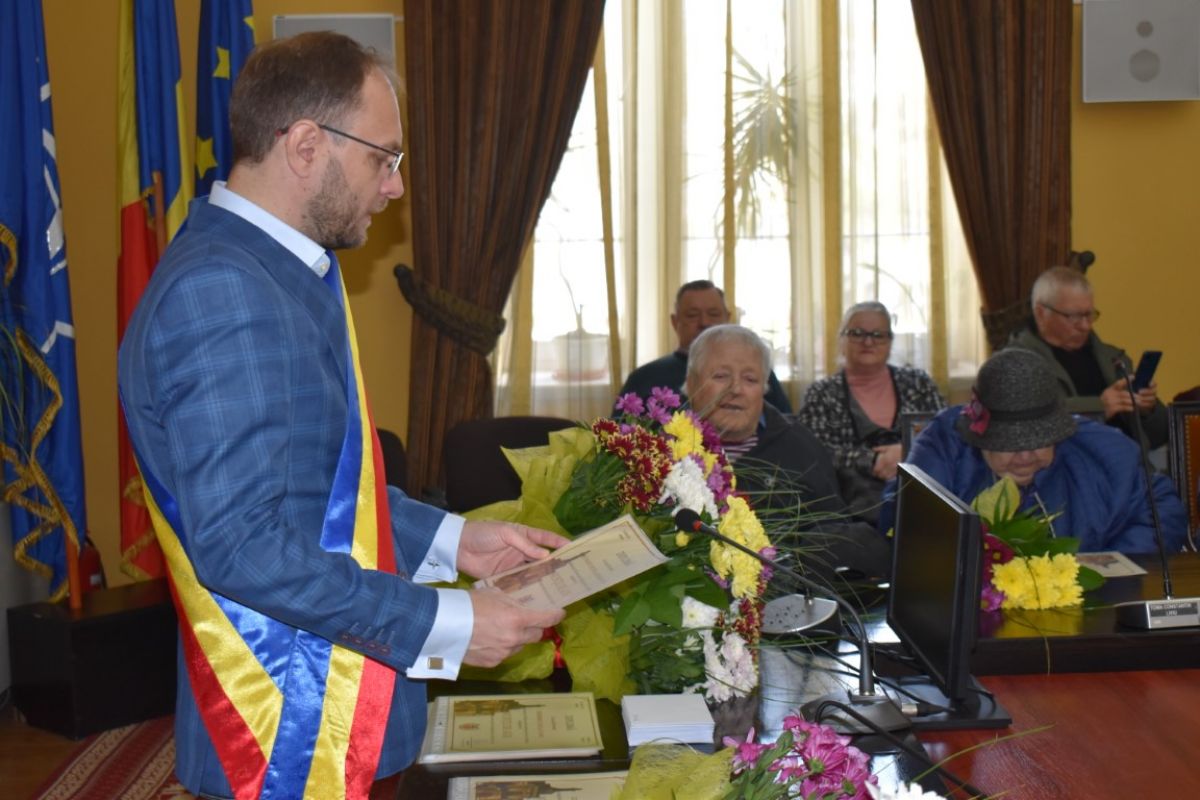 „Suntem aici să ne bucurăm de acest moment care este deopotrivă fericit atât pentru noi cât și pentru dv.”, s-au auzit primele cuvinte ale primarului Cosmin Andrei care a deschis festivitatea de premiere a cuplurilor de aur și a început să strige numele celor prezenți pentru a le înmâna diplome, premii în bani și flori pentru doamne.