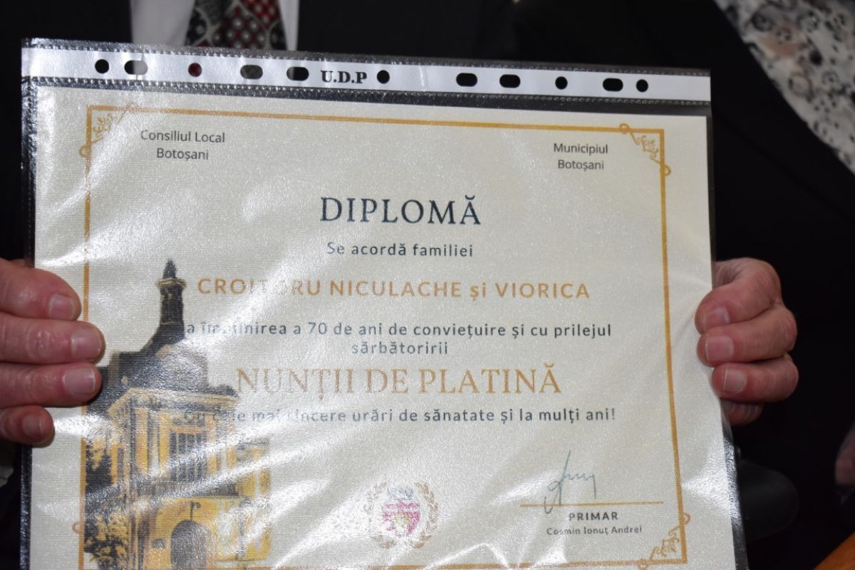 Și un vers scris chiar de mâna poetului nepereche, Mihai Eminescu. De la Primărie, nu și-au dorit decât diploma care le marchează cei 70 de ani de căsătorie, pentru a o pune la colecția familiei, care ulterior le va aminti copiilor povestea lor de dragoste.