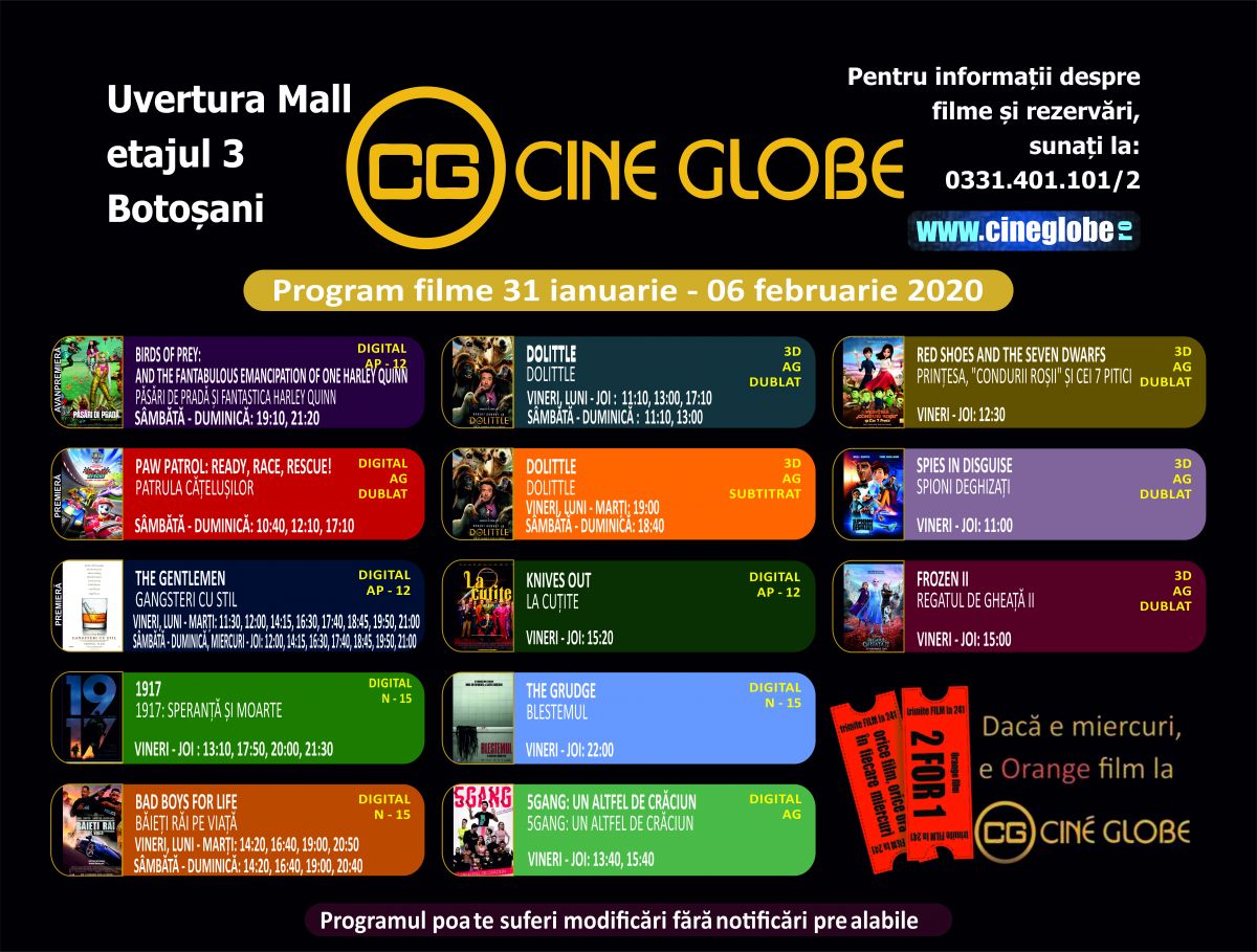 Vezi mai jos PROGRAMUL Cine Globe Botoșani: