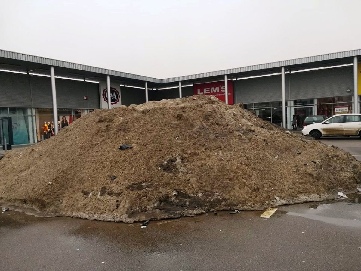 Un munte de gheață și zăpadă s-a ridicat în parcarea de la Kaufland. Semn că, spre deosebire de parcările municipalității, în cea privată cineva chiar s-a obosit să strângă zăpada și să facă loc și mașinilor