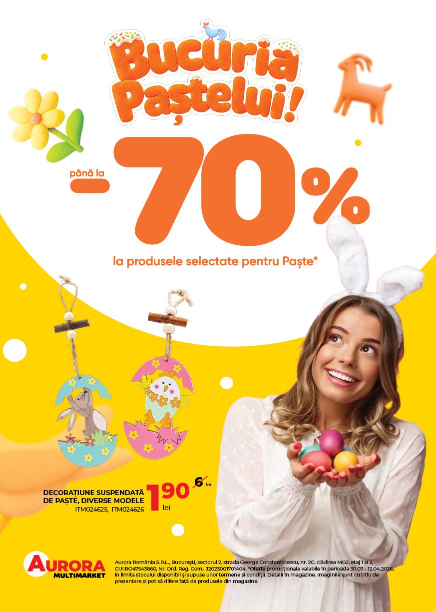 (P) Aurora Multimarket dă startul campaniei de Paște cu reduceri de până la 70% la sute de produse, disponibilă între 30 martie și 12 aprilie, în toate magazinele din țară.