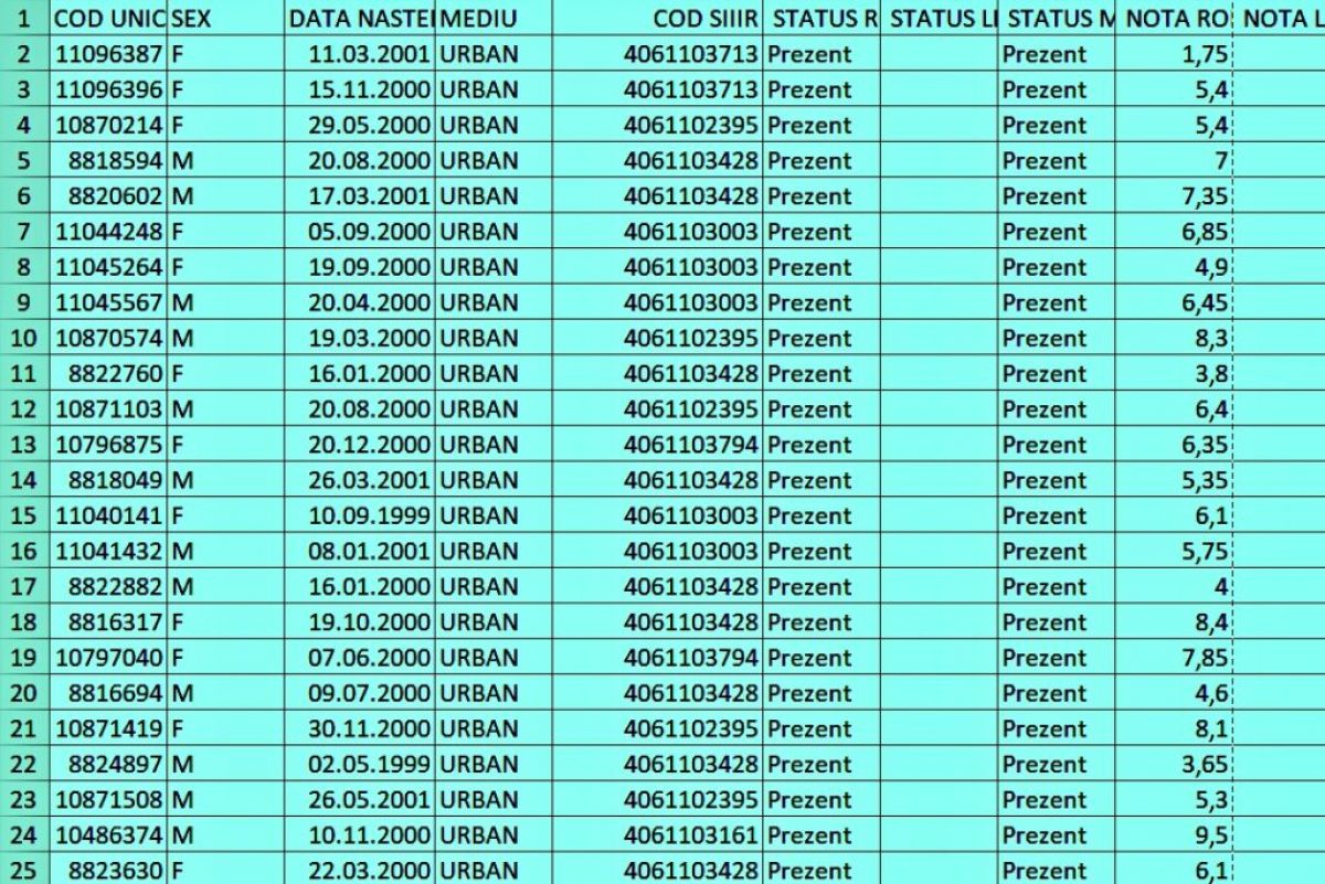 (Foto jos: Exemplu de anonimizare a rezultatelor la Evaluarea Națională. Sursa: data.gov.ro)
