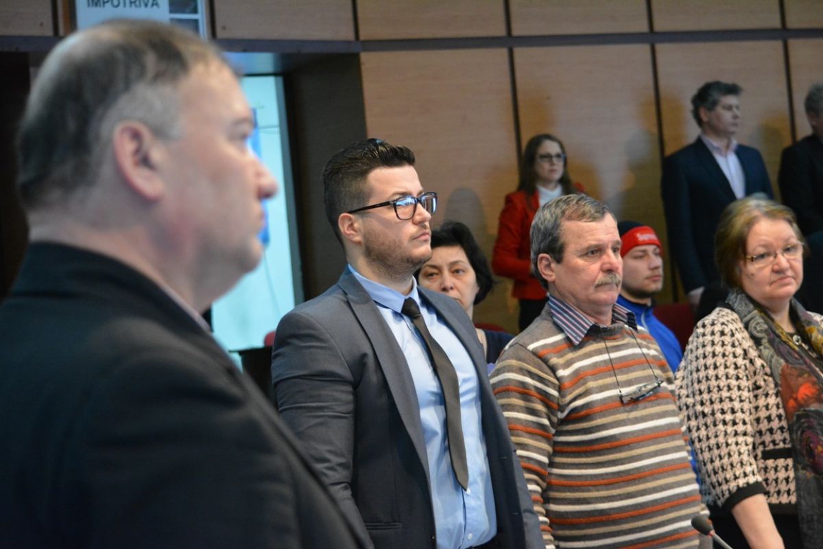 Trei consilieri judeţeni PNL au votat împotriva proiectului, iar lor li s-a alăturat, spre surprinderea asistenţei, şi social-democratul Gheorghe Nazare (foto, primul din stânga), care nu luase cuvântul şi care nu şi-a motivat în nici un fel votul.