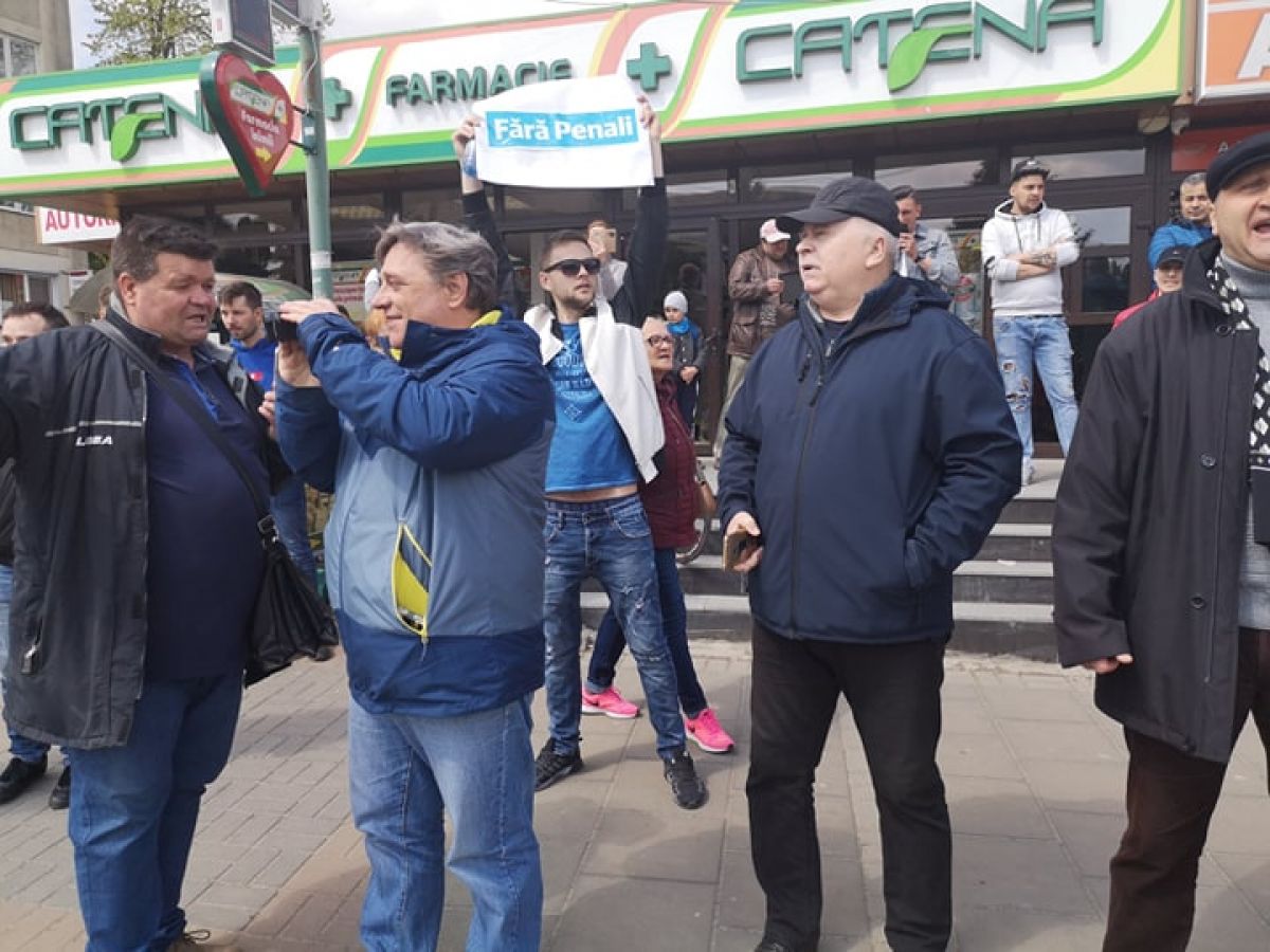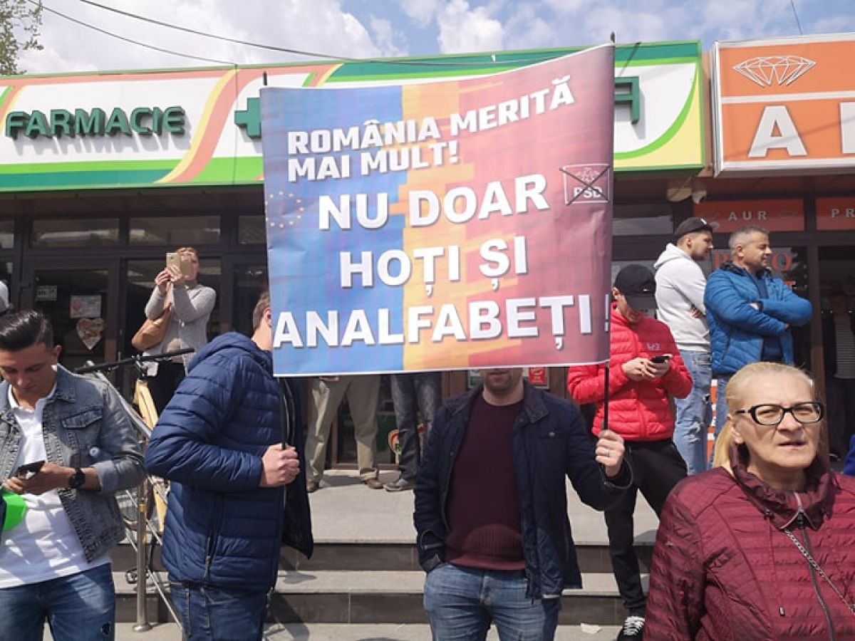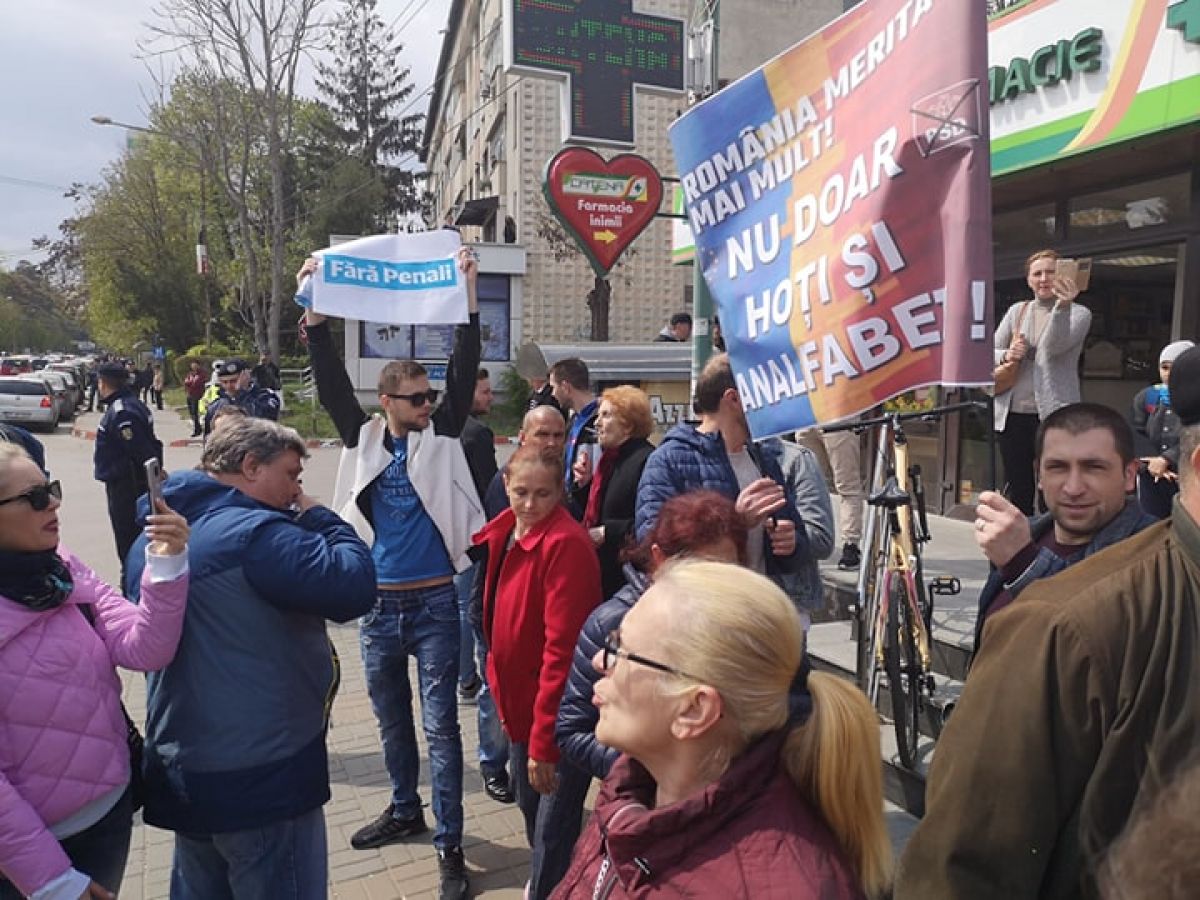 În jur de aproximativ 20 de persoane au ocupat poziţii pe strada Marchian, vis a vis de amintita instituţie de cultură, unde scandează lozinci împotriva PSD şi a preşedintelui acestui partid.