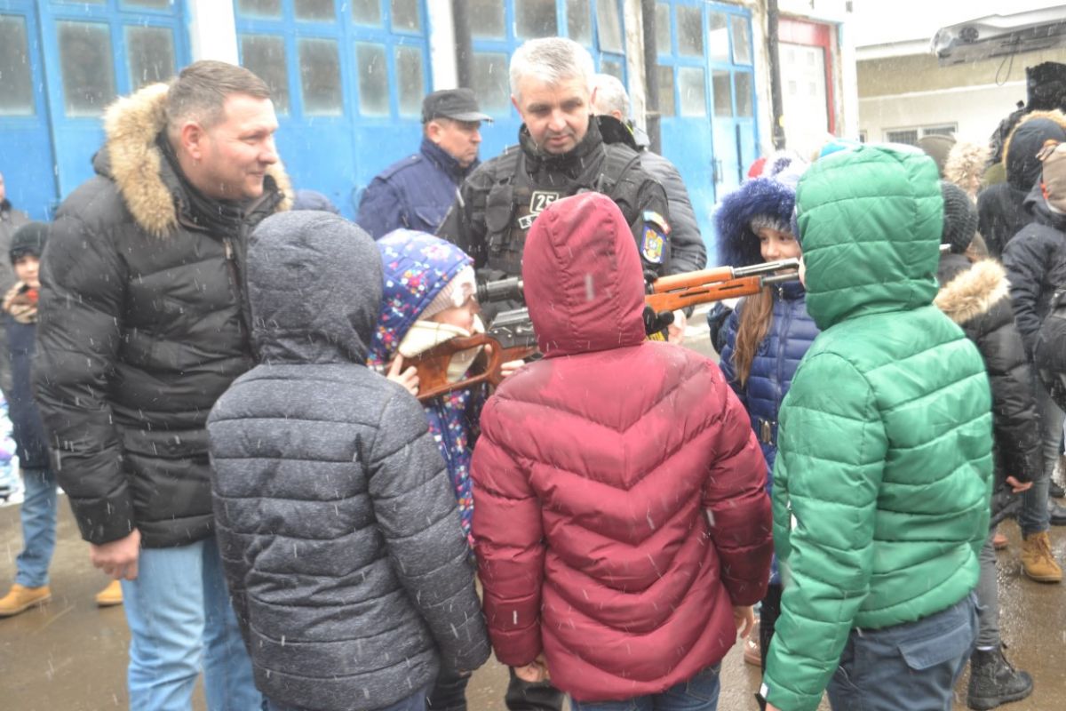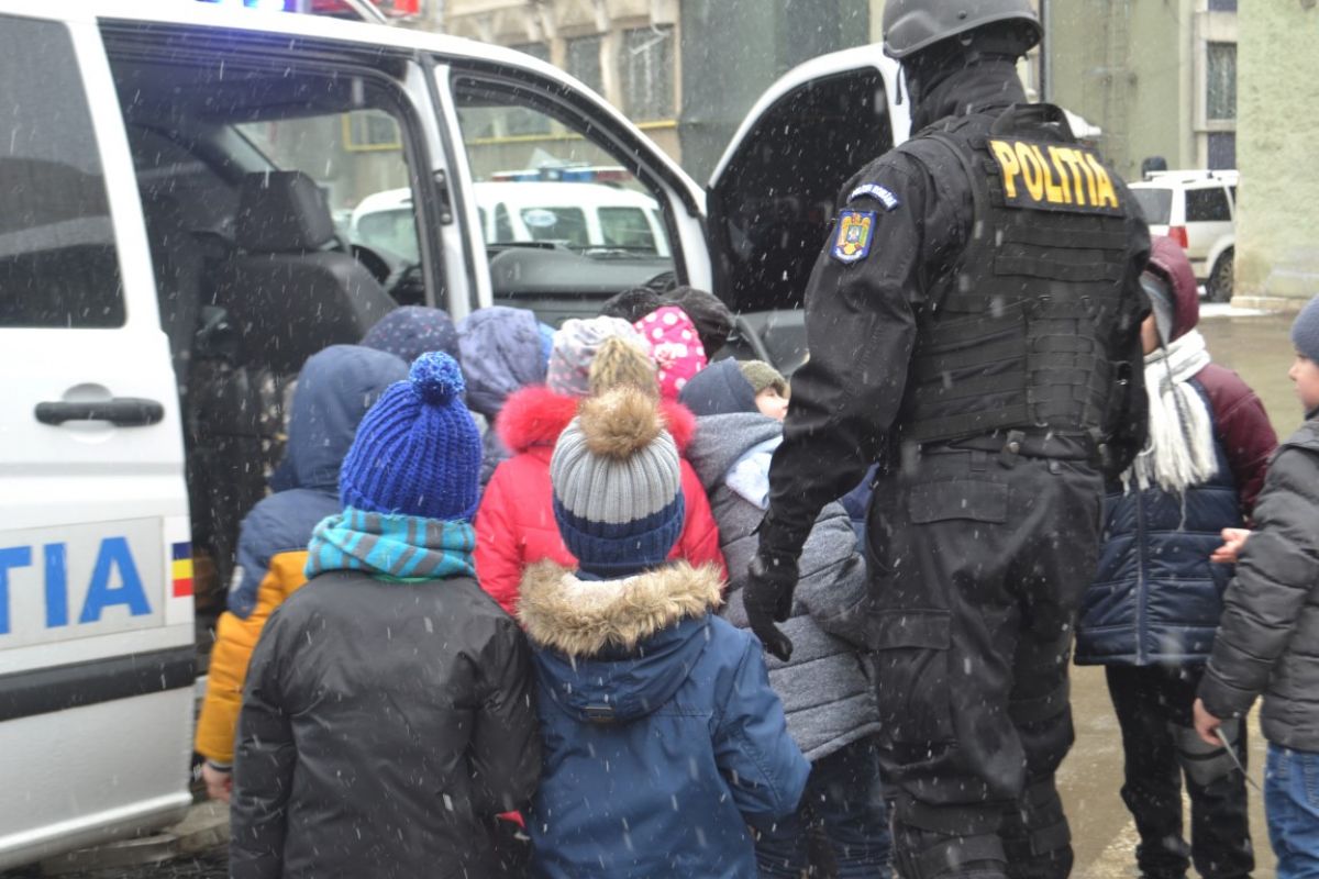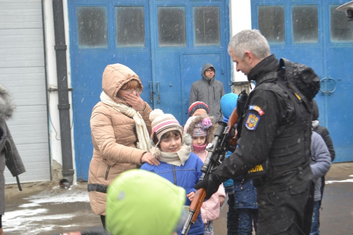 În ciuda vremii potrivnice, mai mulți copii au venit în curtea IPJ, fiind încântați de cele prezentate de polițiști.