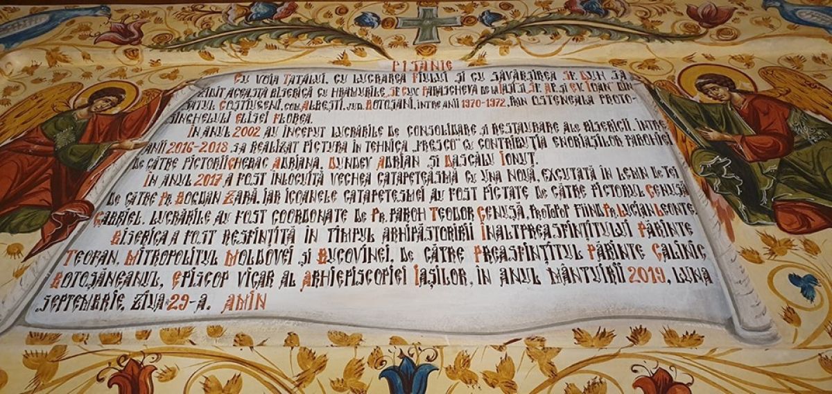 Și iată că, după trudnica muncă depusă, duminică, 29 septembrie 2019, sfântul locaş a primit veșmântul sfințirii, finalizându-se ample lucrări de înfrumusețare, atât la exterior, cât și în interior. Este un adevărat curaj să te apuci de o asemenea muncă, ajutat doar de o mână de oameni, într-o zonă așa retrasă, cu drumuri presărate cu o sumedenie de hârtoape rămase parcă din timpul Binecredinciosului Voievod Ștefan. Dar se vede că realitatea este alta: un sat mic, având locuitori cu inimi mari și credință statornică; un preot tânăr, însă cu gândirea și lucrarea mature, dospite în cuptorul credinței frumoasei sale familii şi a școlilor urmate, care l-au copt și pregătit pentru o atât de grea, dar nobilă misiune.