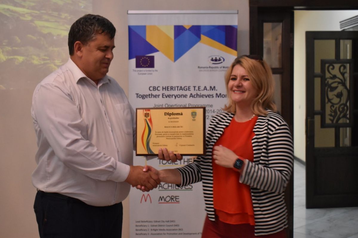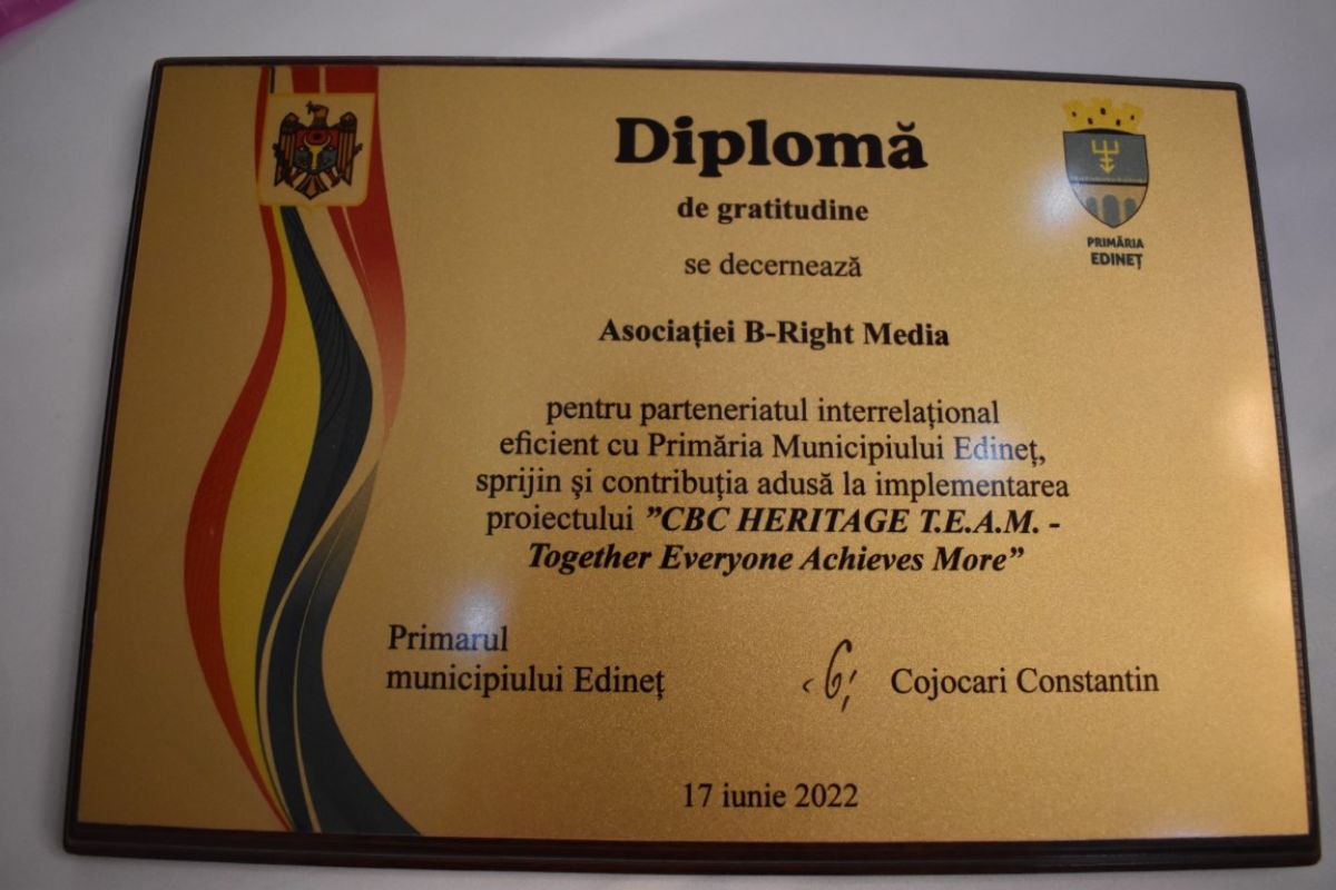 Conferința de închidere a proiectului ”CBC Heritage T.E.A.M. Together Everyone Achieves More” sau TEAM pe scurt, a avut loc pe data de 17 iunie 2022 la Edineț, în prezența oficialităților și partenerilor moldoveni și a echipei de implementare din partea Asociației B-Right Media de la Botoșani.
