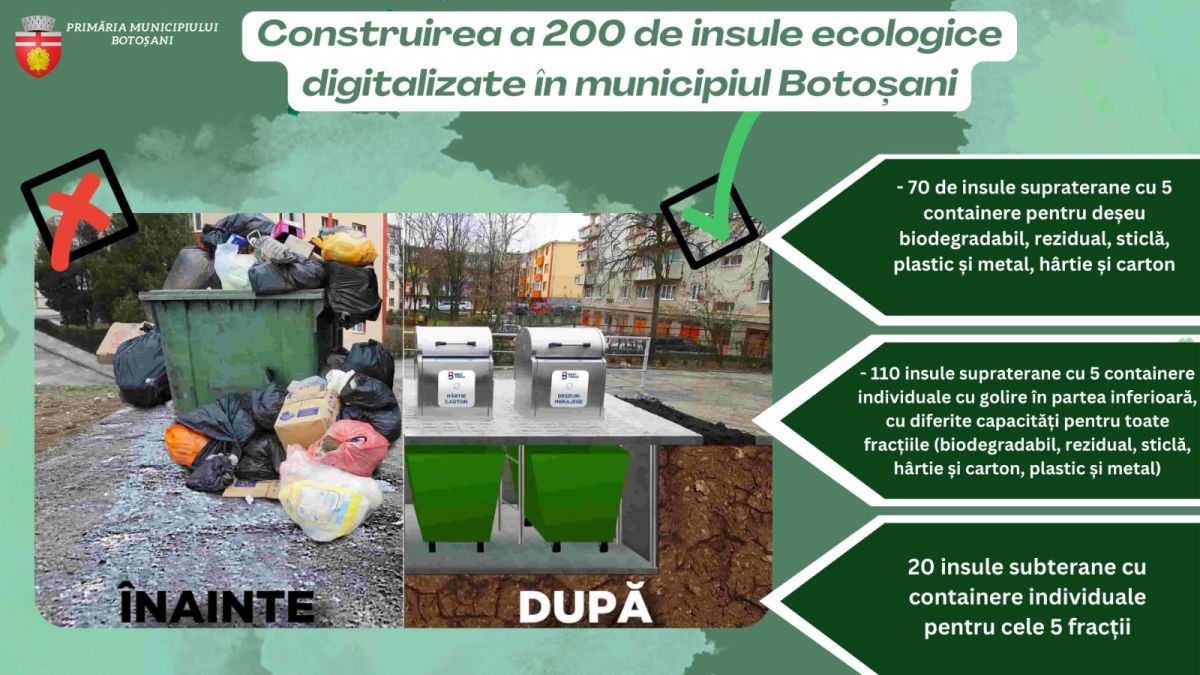 Prin acest proiect se dorește amenajarea a 200 de insule ecologice digitalizate pentru dezvoltarea unui sistem eficient de management al deșeurilor la nivelul municipiului Botoșani.
