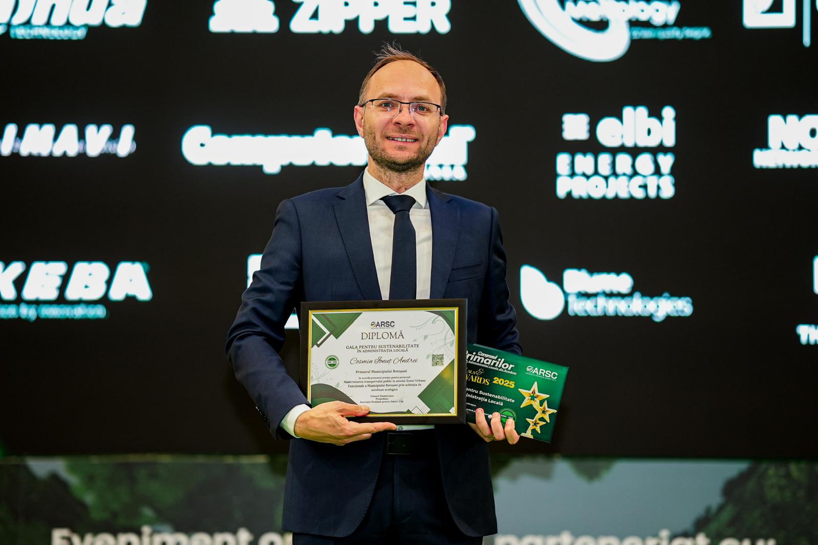 Premiul obținut pentru proiectul „Modernizarea transportului public la nivelul Zonei Urbane Funcționale a municipiului Botoșani prin achiziția de autobuze electrice”, la Categoria Mobilitate Urbană Sustenabilă, a fost acordat primarului Cosmin Andrei.
