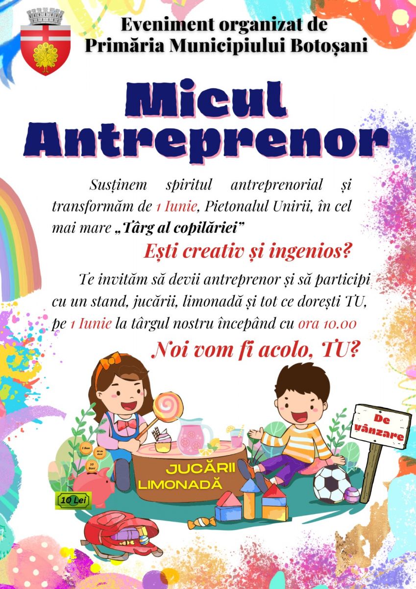 Tot pe Pietonalul Unirii va avea loc primul târg al micilor antreprenori. Copiii cu „simțul afacerilor” vor avea standuri cu vânzare de produse alese de ei – jucării, dulciuri, sucuri, etc. și vor fi premiați pentru spiritul antreprenorial.
