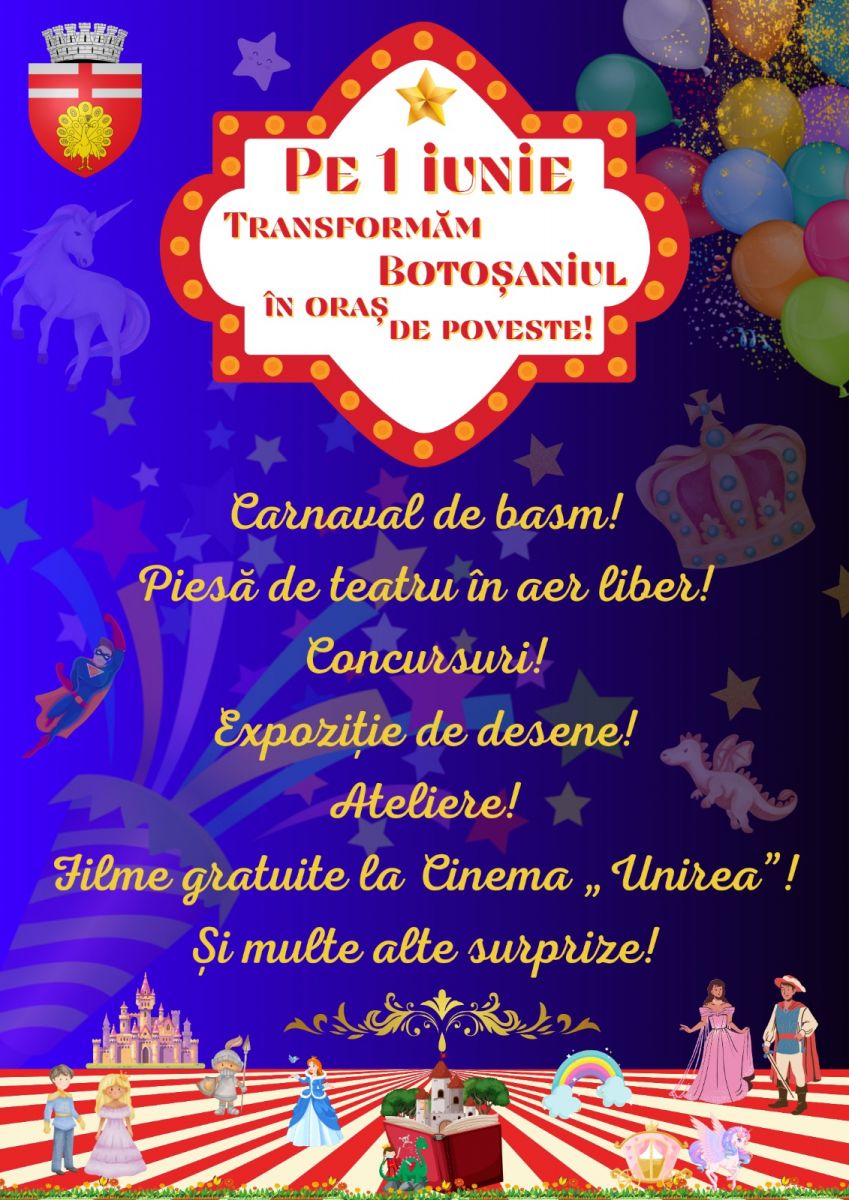 Confetti, baloane, concursuri, spectacole și producții cinematografice, ateliere și defilarea personajelor de poveste, toate acestea dar și multe altele vor fi puse la dispoziția copiilor, din dorința Primăriei Municipiului Botoșani de a crea, pentru cei mici, de ziua lor, „o lume de poveste”, se arată într-un comunicat trimis de instituție.