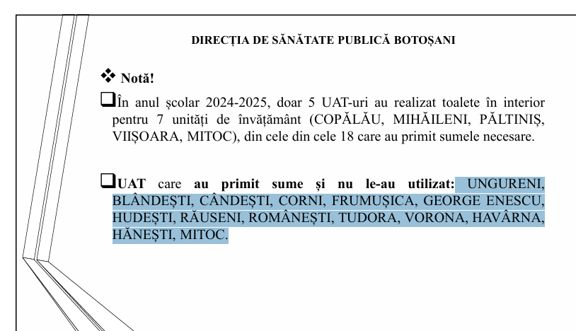 Cele care au avut bani și nu i-au cheltuit au fost reliefate de Direcția de Sănătate Publică (DSP) Botoșani după cum urmează: