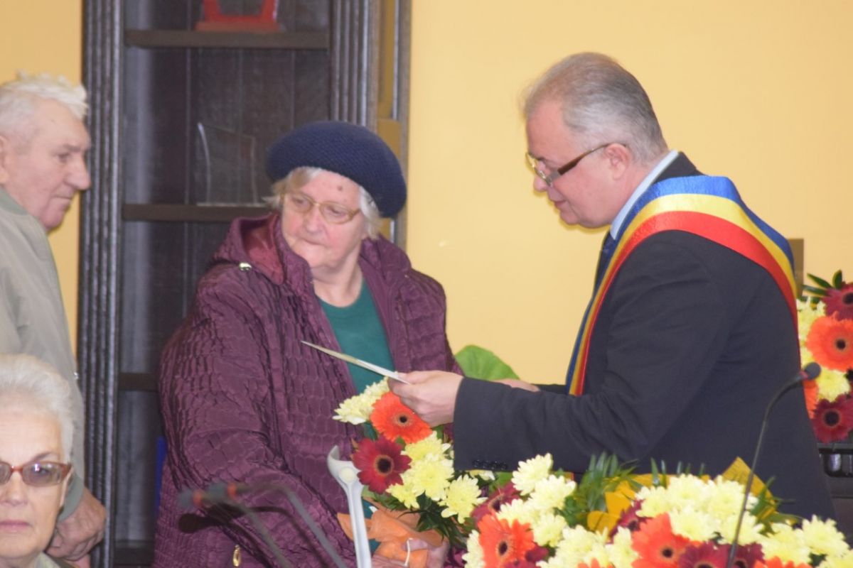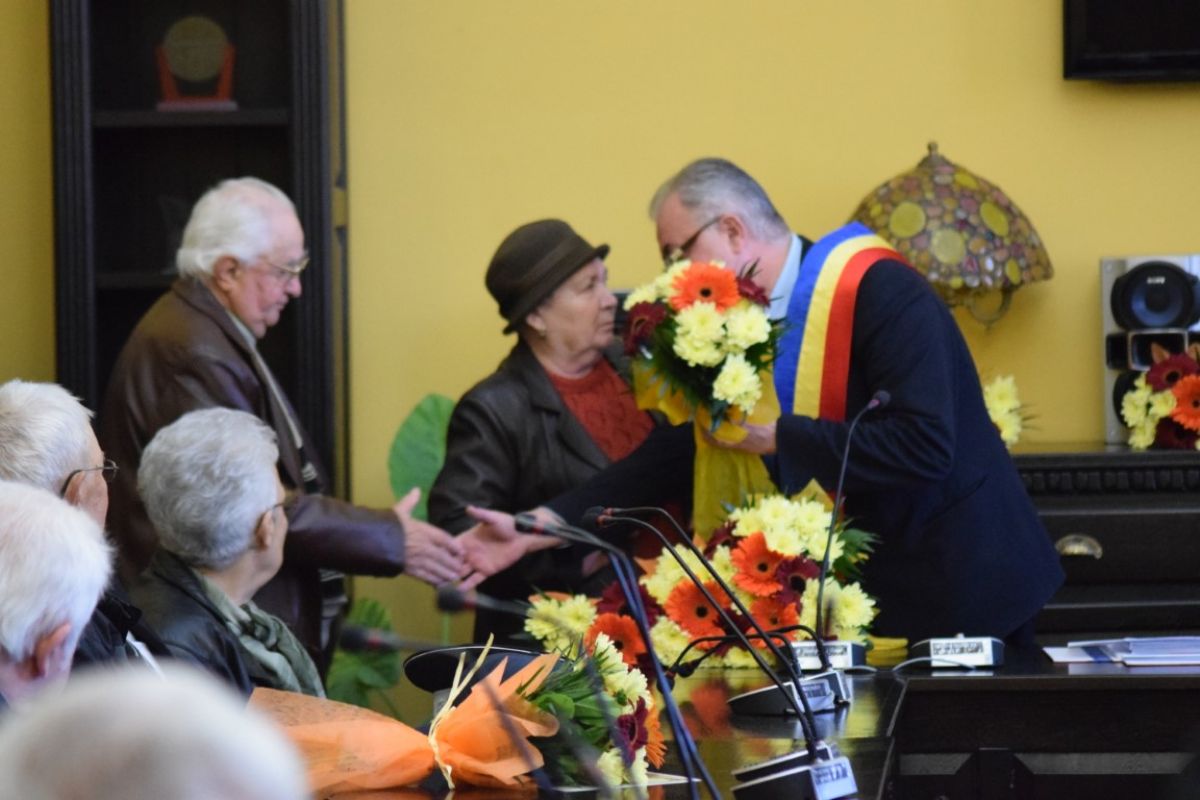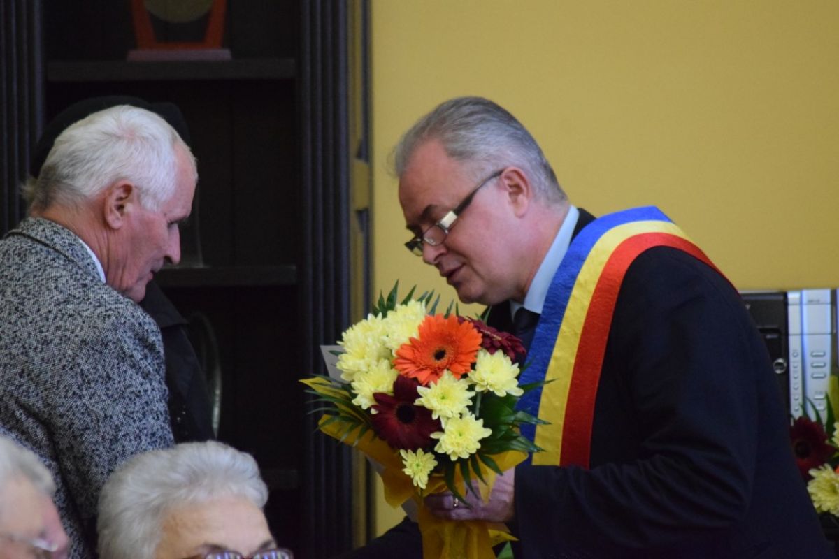 Au fost premiate astăzi la Primărie de către Cătălin Flutur care le-a ținut un scurt discurs, le-a înmânat premii (500 lei pentru nunta de aur și 1.000 lei pentru cea de diamant), diplome și flori.