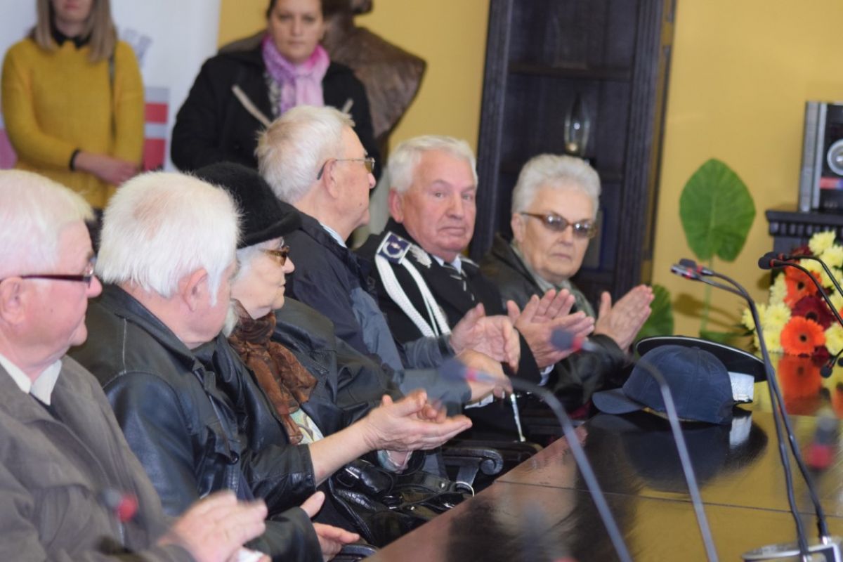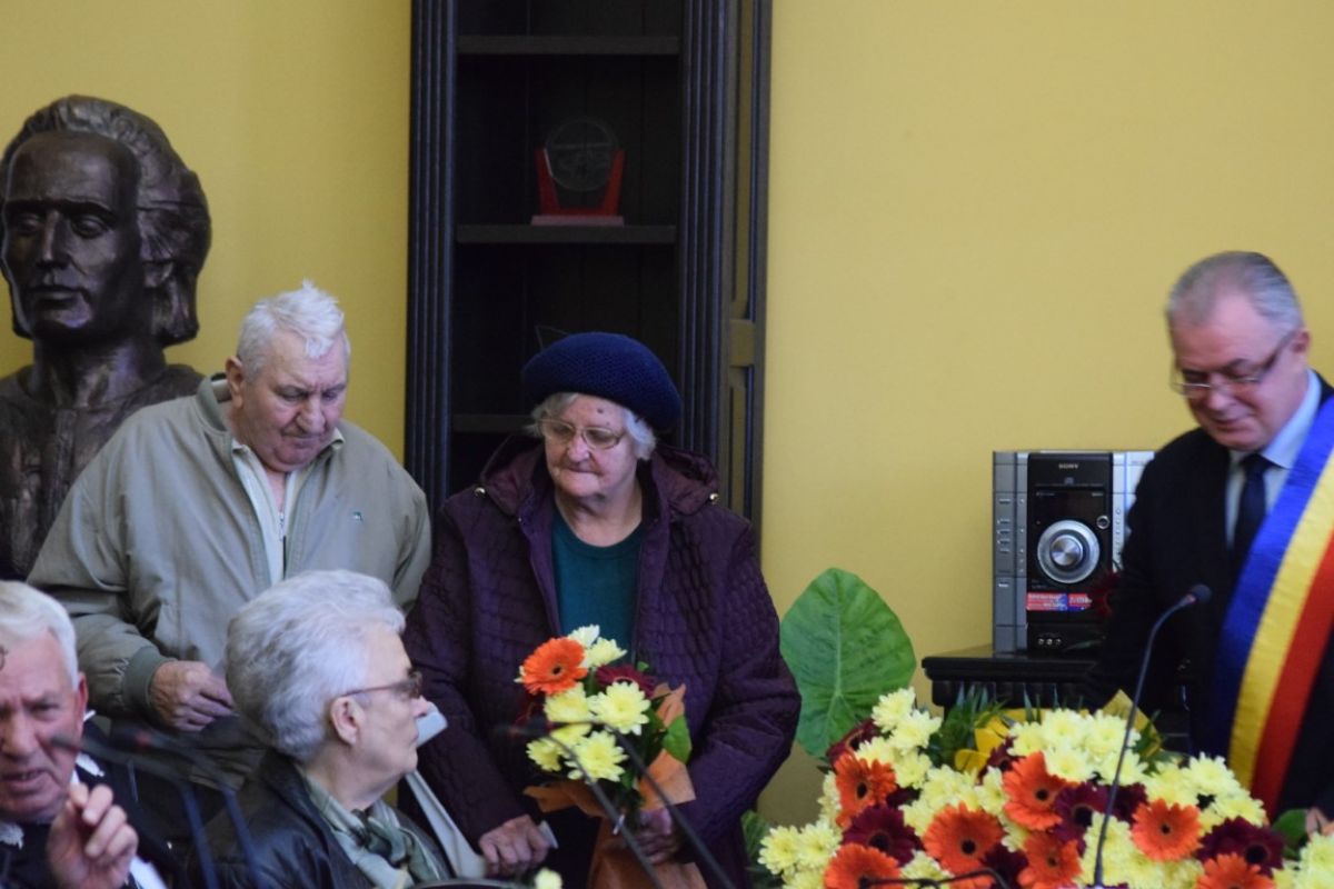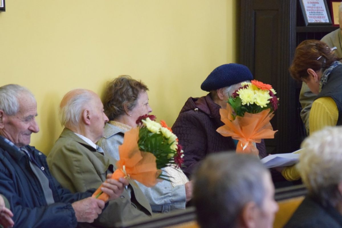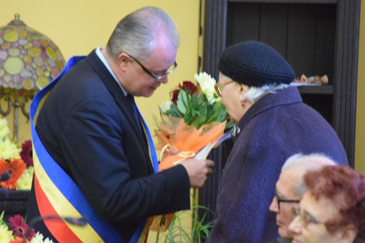 Au fost premiate astăzi la Primărie de către Cătălin Flutur care le-a ținut un scurt discurs, le-a înmânat premii (500 lei pentru nunta de aur și 1.000 lei pentru cea de diamant), diplome și flori.