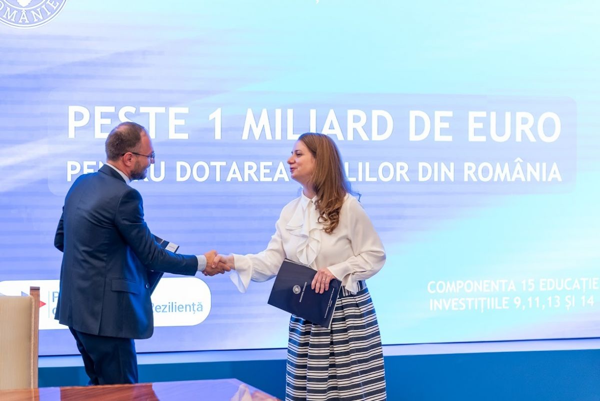 Acțiunea a avut loc la Palatul Victoria, unde s-a semnat contractul de finanțare destinat dotării unităților de învățământ preuniversitar, cu mobilier, laboratoare de informatică și de științe, cabinete școlare, ateliere de practică și echipamente IT.