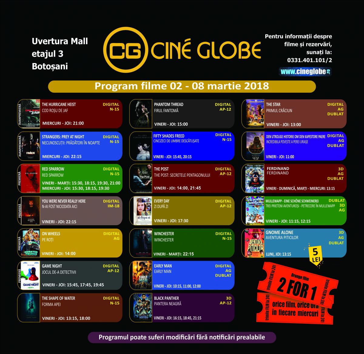 În perioada 2– 8 martie 2018 multiplexul din Uvertura Mall Cine Globe invită botoșănenii să urmărească în avanpremieră cele mai noi filme.