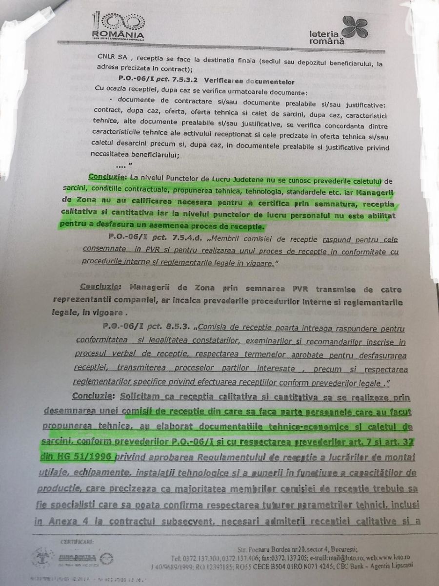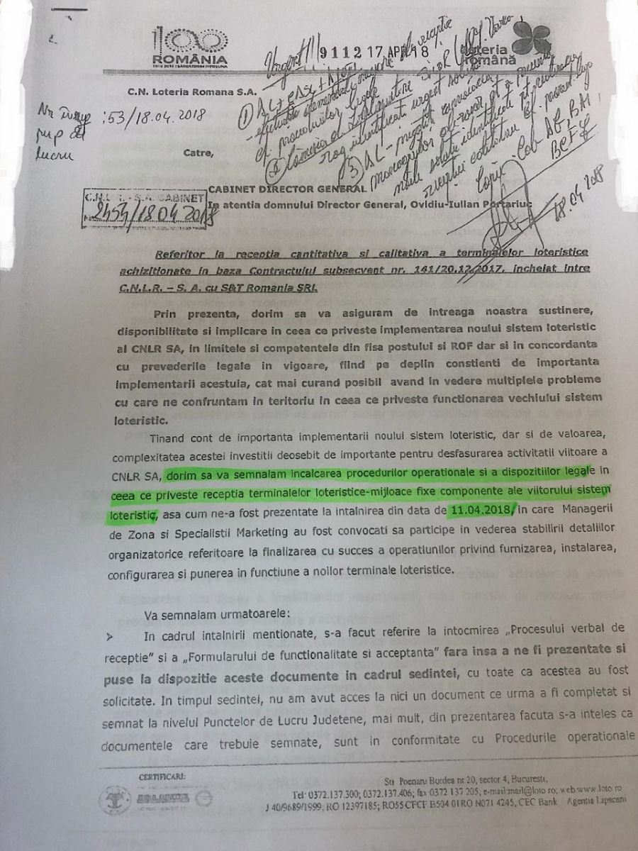 “Dorim să vă semnalăm încălcarea procedurilor operaţionale şi a dispoziţiilor legale în ceea ce priveşte recepţia terminalelor loteristice – mijloace fixe componente ale viitorului sistem loteristic”,
