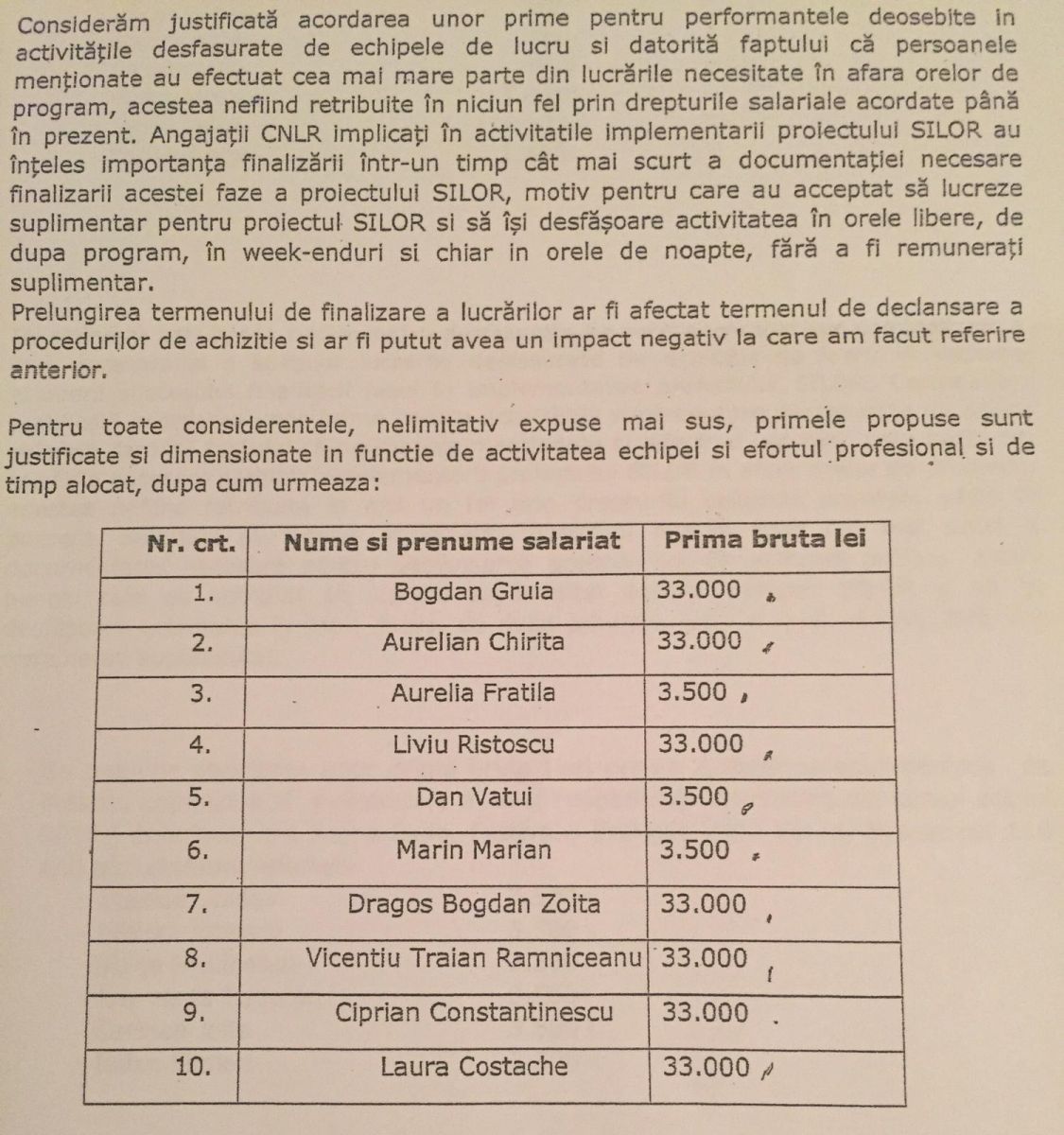 Problema este însă că, persoanele în cauză, angajate ale CNLR, au luat prime consistente pentru această activitate, adică elaborarea documentației tehnico-științifice și caietul de sarcini, iar acum nu mai doresc să facă recepția.