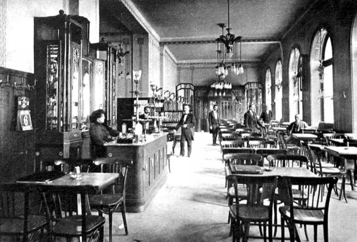 Cum arata o cafenea a acelor timpuri e uşor de închipuit. În una din dughenile oraşului ce se înşirau una după ala ca mărgele pe aţă, scunde şi întunecoase, iluminate cu lumânări, amenajate cu măsuţe lucrate „din topor”, fără nicio faţă de masă, se putea bea o cafea sau o bragă, se putea servi şi ceva dulce, căci erau în acelaşi timp şi cofetării. Cei în vârstă jucau ore întregi cărţi şi biliard, fumându-şi în linişte luleaua umplută cu tutun turcesc. În faţa cafenelei se găsea amenajată ceea ce se numeşte astăzi o terasă, ferită deasupra de un acoperiş din stuf sau şindrilă ce apăra clienţii de soare şi ploi.