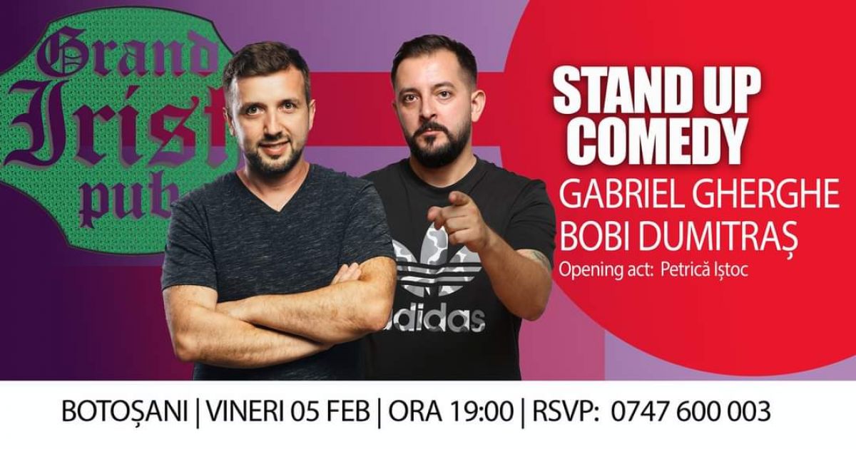 Mai exact, vineri, 5 februarie 2021, vin la Botoșani comedianții Gabriel Gherghe și Bobi Dumitraș. Biletul costă 30 de lei.