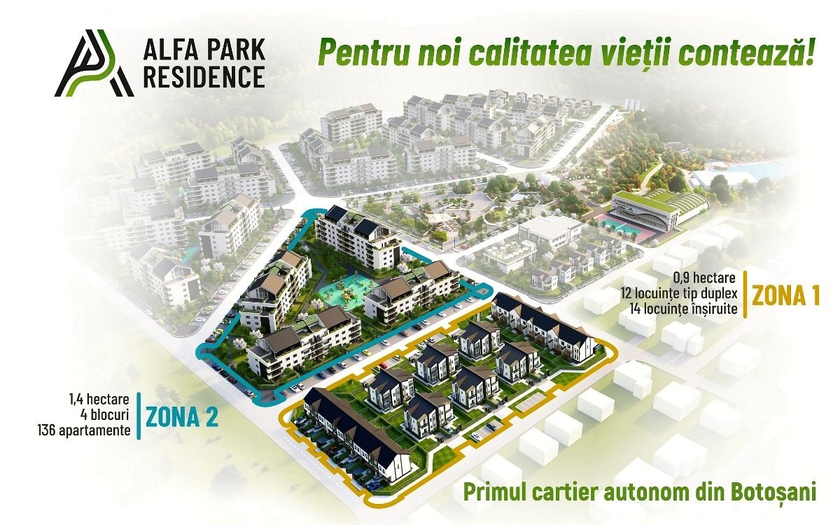 ALFA PARK Residence este un concept rezidențial de anvergură, dezvoltat de grupul de firme Electroalfa, bazat pe o viziune ce pune oamenii și cadrul natural pe primul loc, ce va integra 46 de case și 848 apartamente, cu spații comune de agrement, spații de servicii și facilități extinse, pe o suprafață totală de 12 hectare, creând astfel premisele pentru cartierul cu cei mai buni indicatori de calitate a vieții din Botoșani: