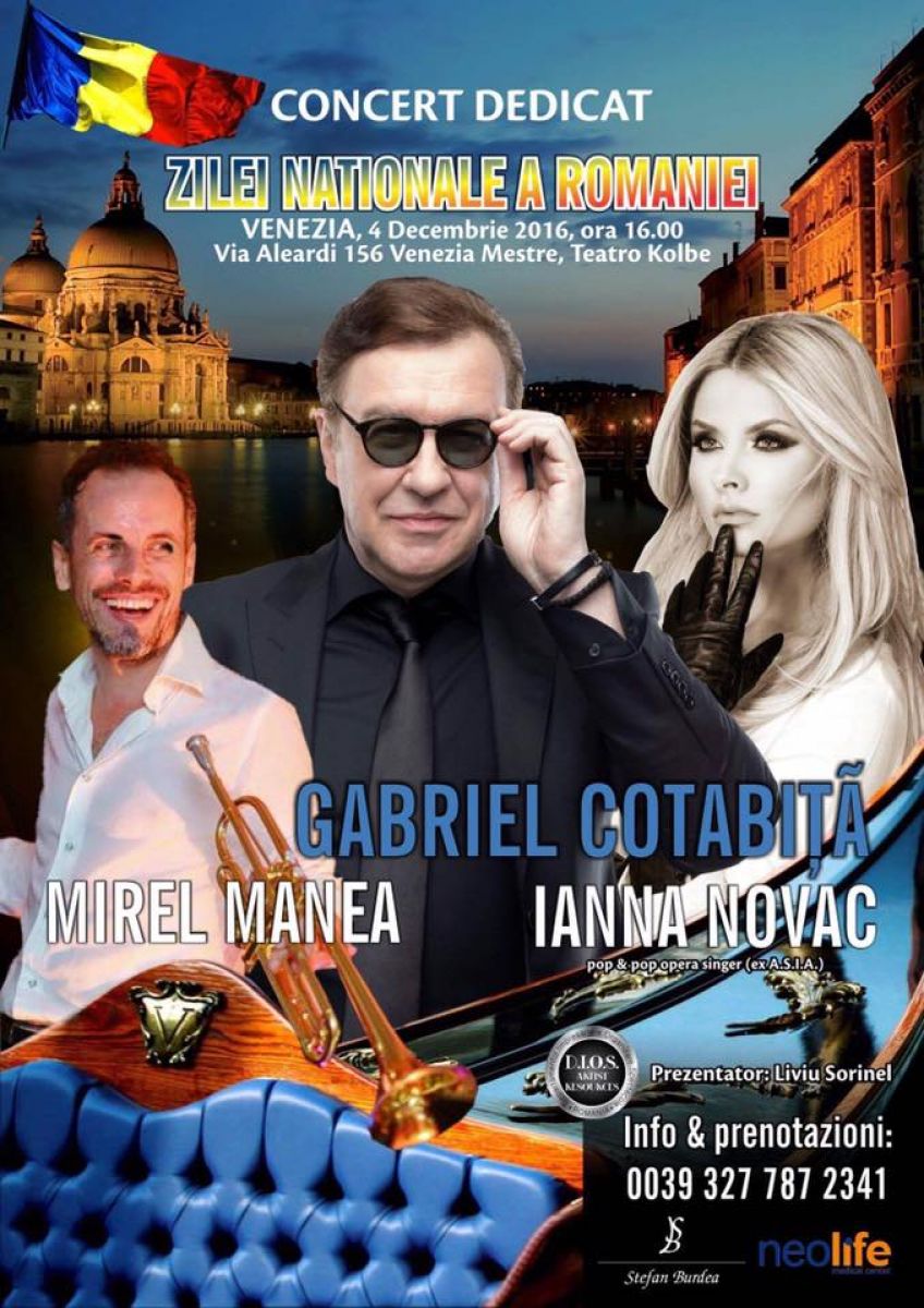 DIOS – Artist Resources România, compania controlată de Robert Duduc şi Liviu Sorinel, organizează în cel mai frumos oraş al Italiei un spectacol dedicat tocmai Zilei Naţionale a României. Alături de Mirel Manea, pe scena amintitei instituţii de cultură vor mai urca, printre alţii, cântăreţul Gabriel Cotabiţă, soprana pop-opera Ianna Novac şi violoncenista Mirona Matlinsche.