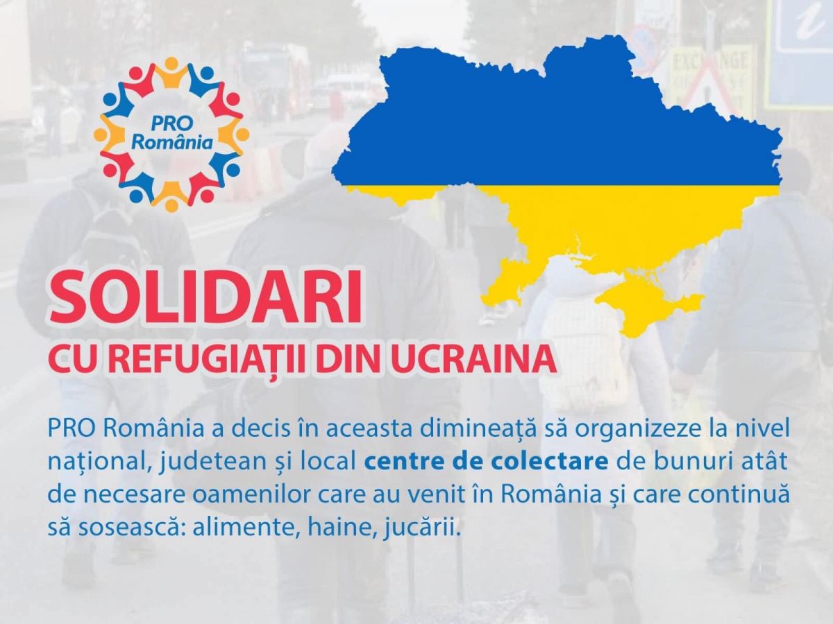 Ca urmare a situației dramatice in care se afla mii de cetățeni ucraineni care și-au părăsit locuințele și tara din cauza bombardamentelor, PRO Romania a decis în această dimineață să organizeze la nivel național, județean și local centre de colectare de bunuri atât de necesare oamenilor care au venit in Romania și care continua sa sosească: alimente, haine, jucării.