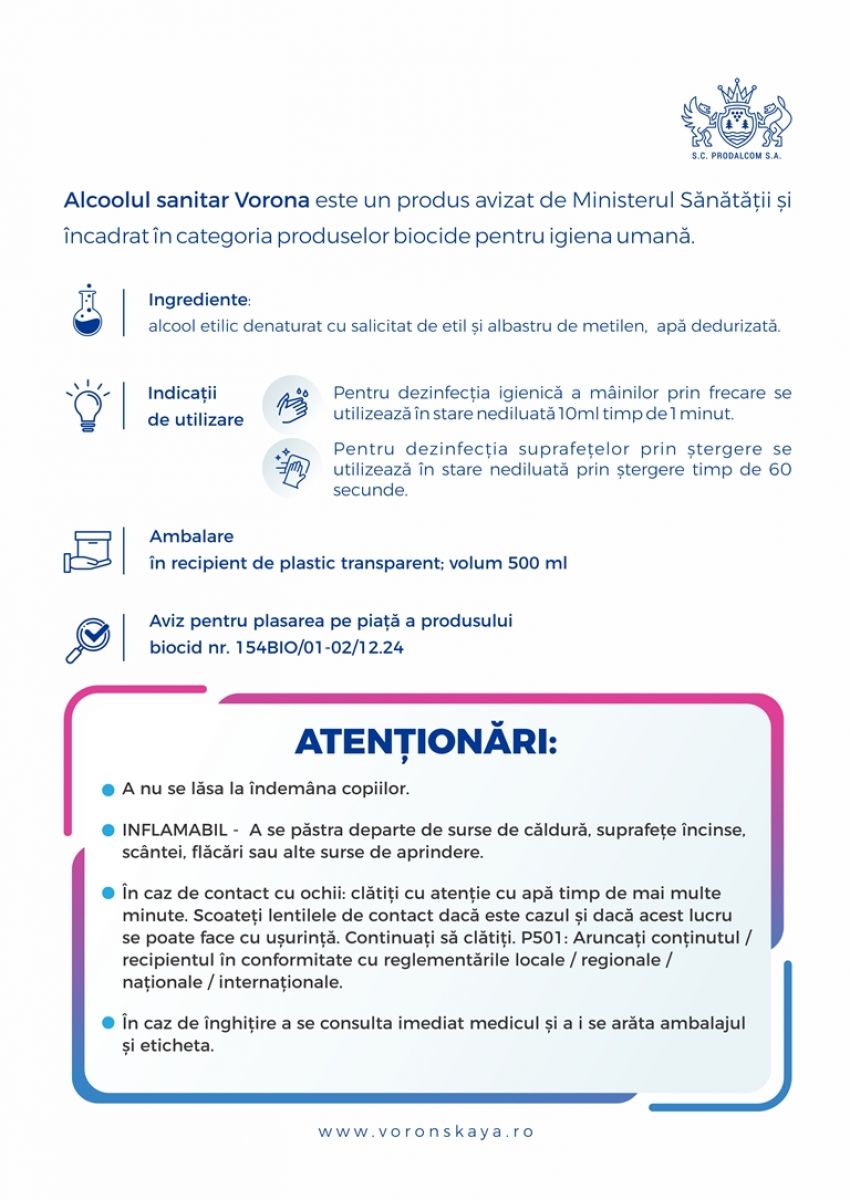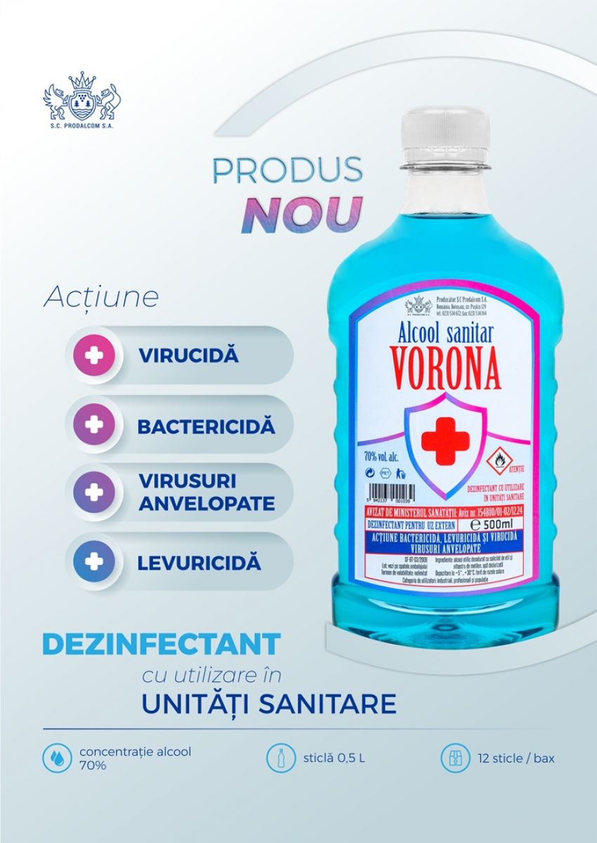 Noul ”Alcool Sanitar Vorona” a fost îmbunătățit cu multiple acțiuni: virucidă, bactericidă, levuricidă și virusuri anvelopate, cum este și coronavirusul.