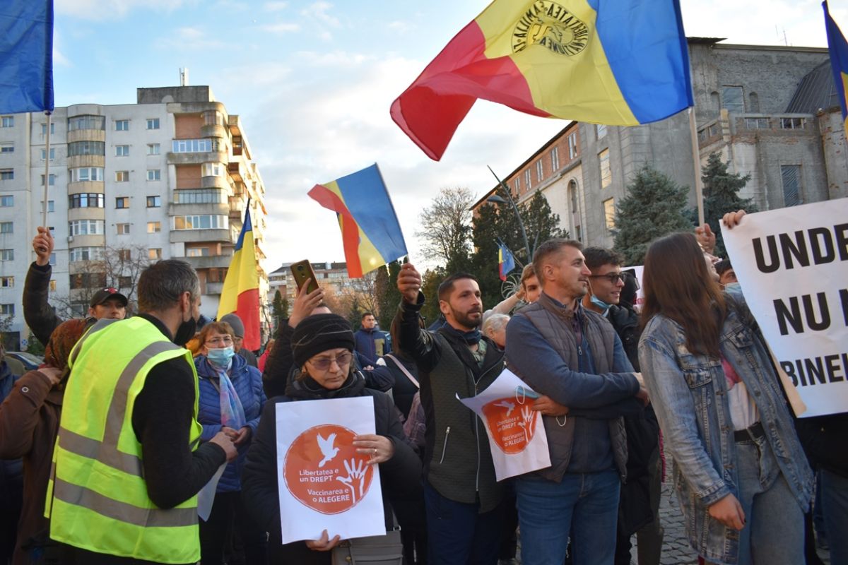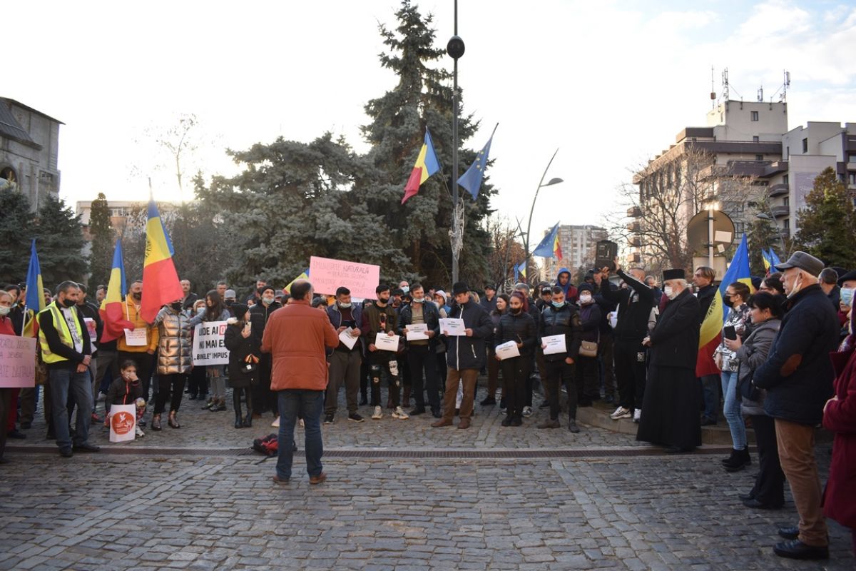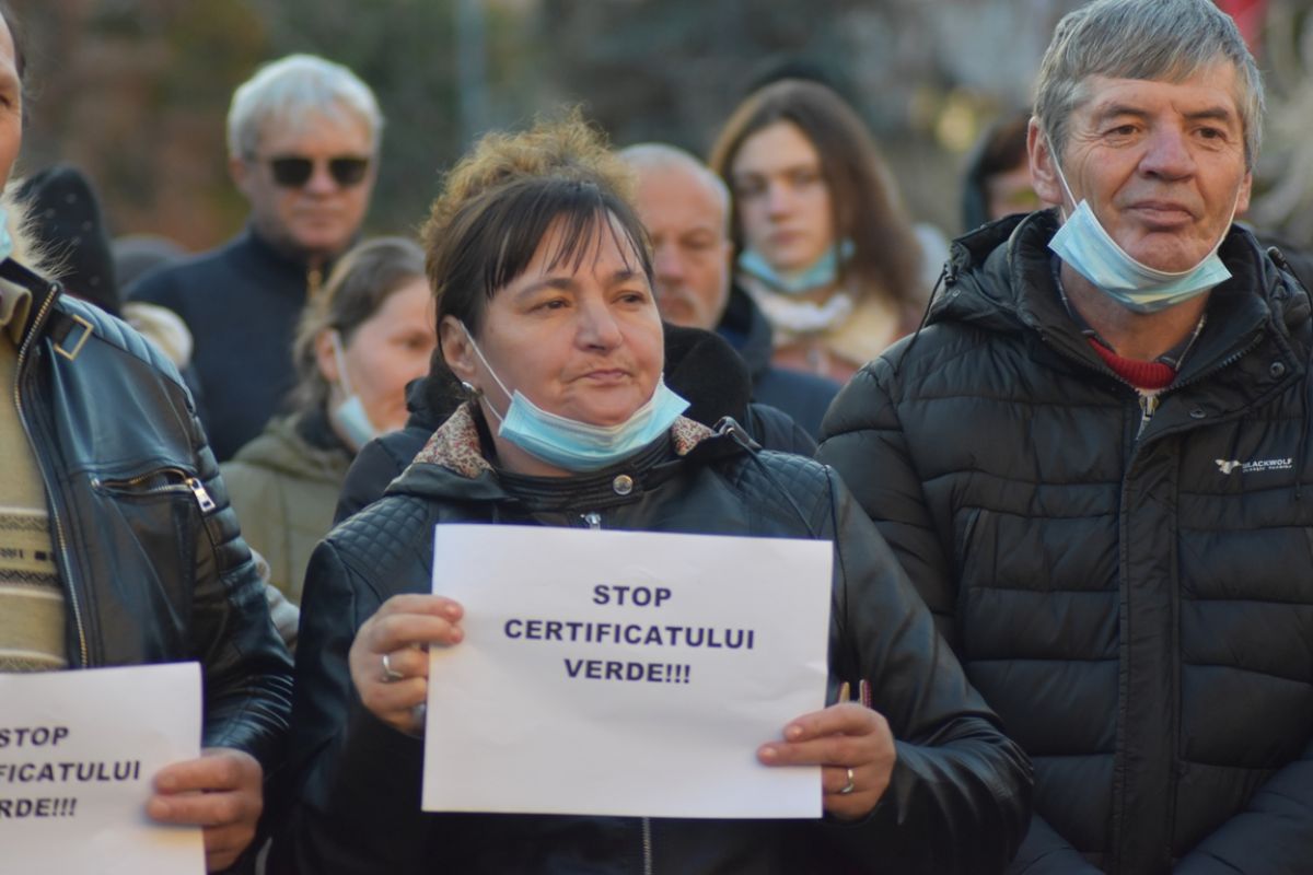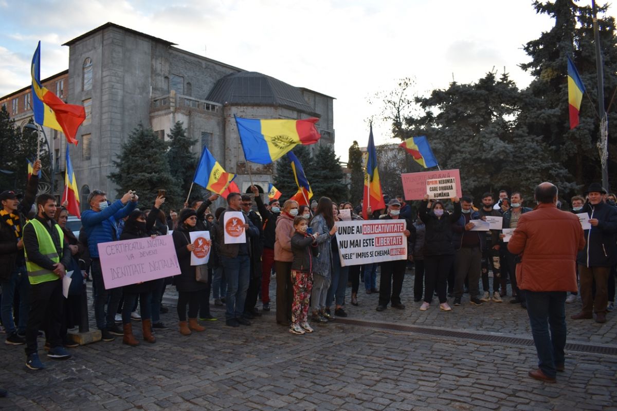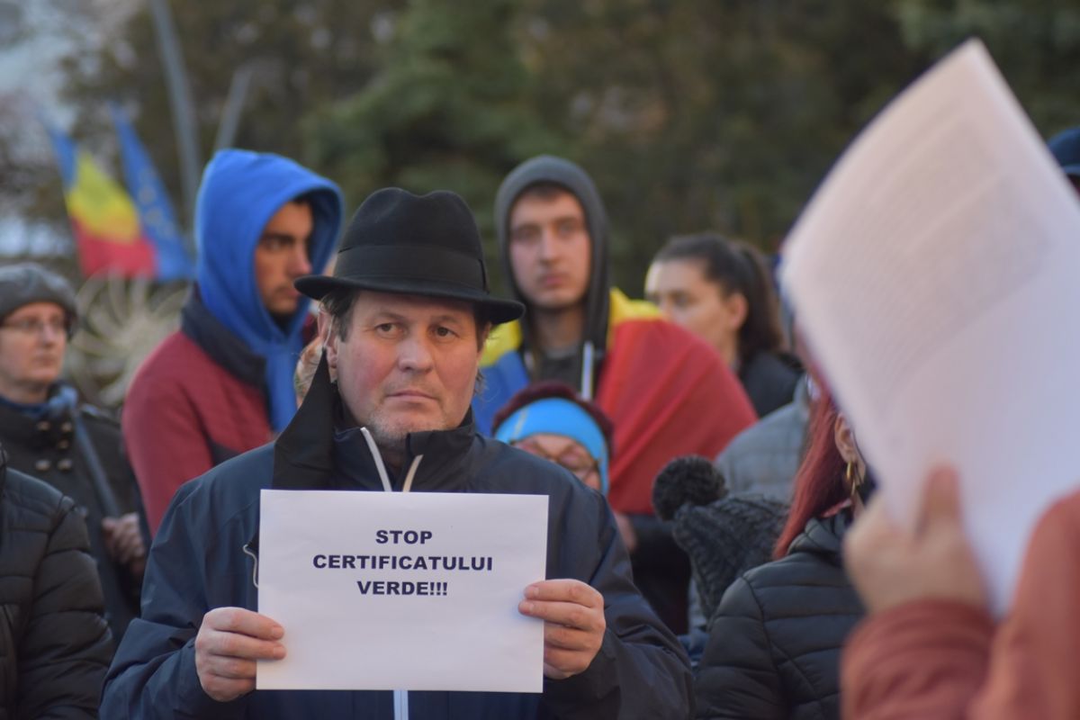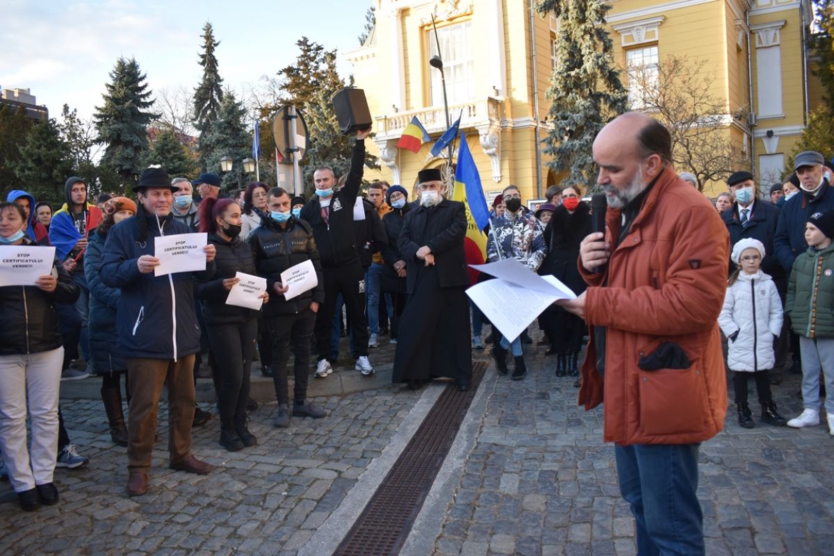 ”Nu ne vaccinăm”, ”Nu votați vaccinul”, ”Fără certificat”, ”Libertate”, s-a strigat la miting. Când s-a ajuns la ultima scandare, profesor a îndemânat să fie astfel completată: ”Libertate fără certificate”.