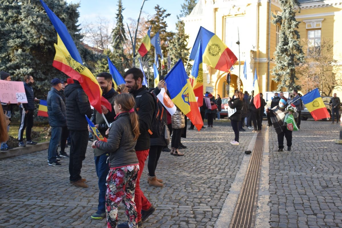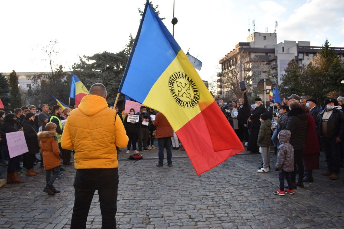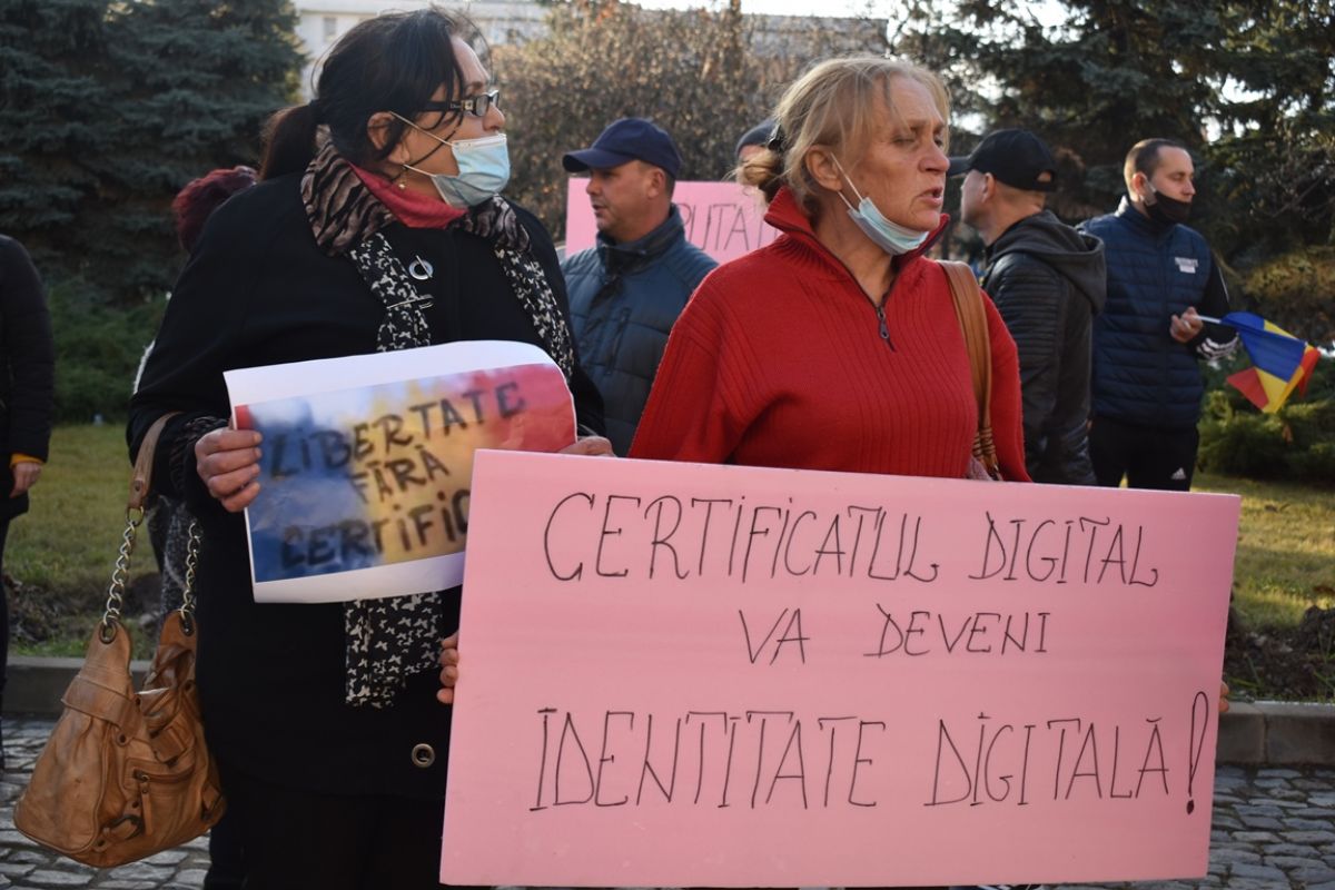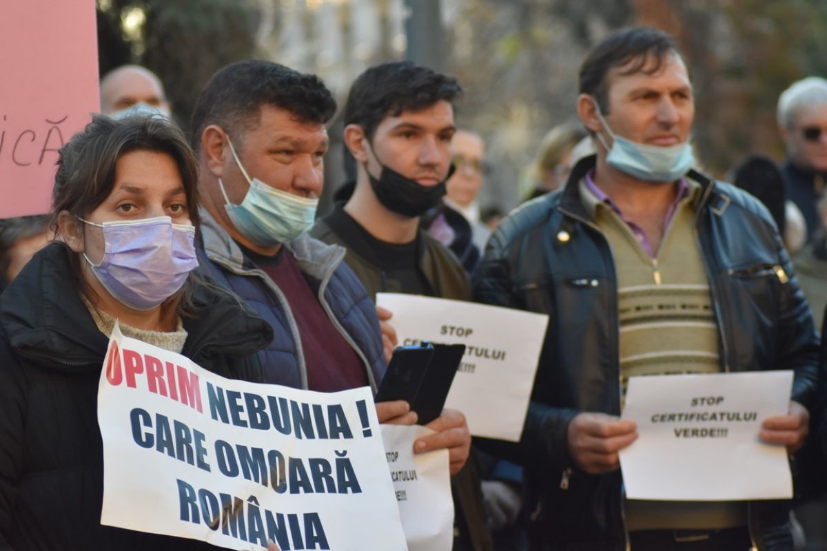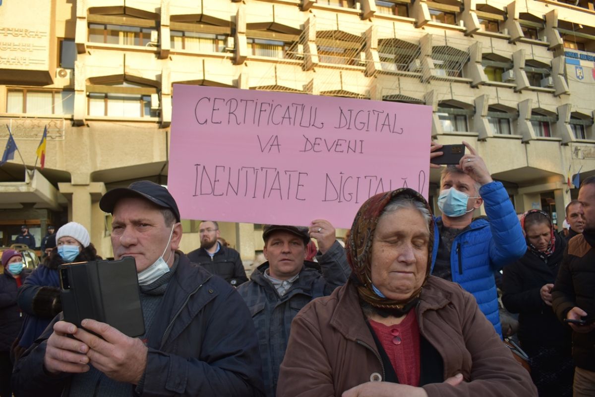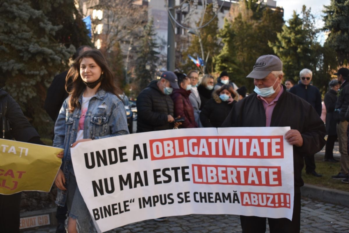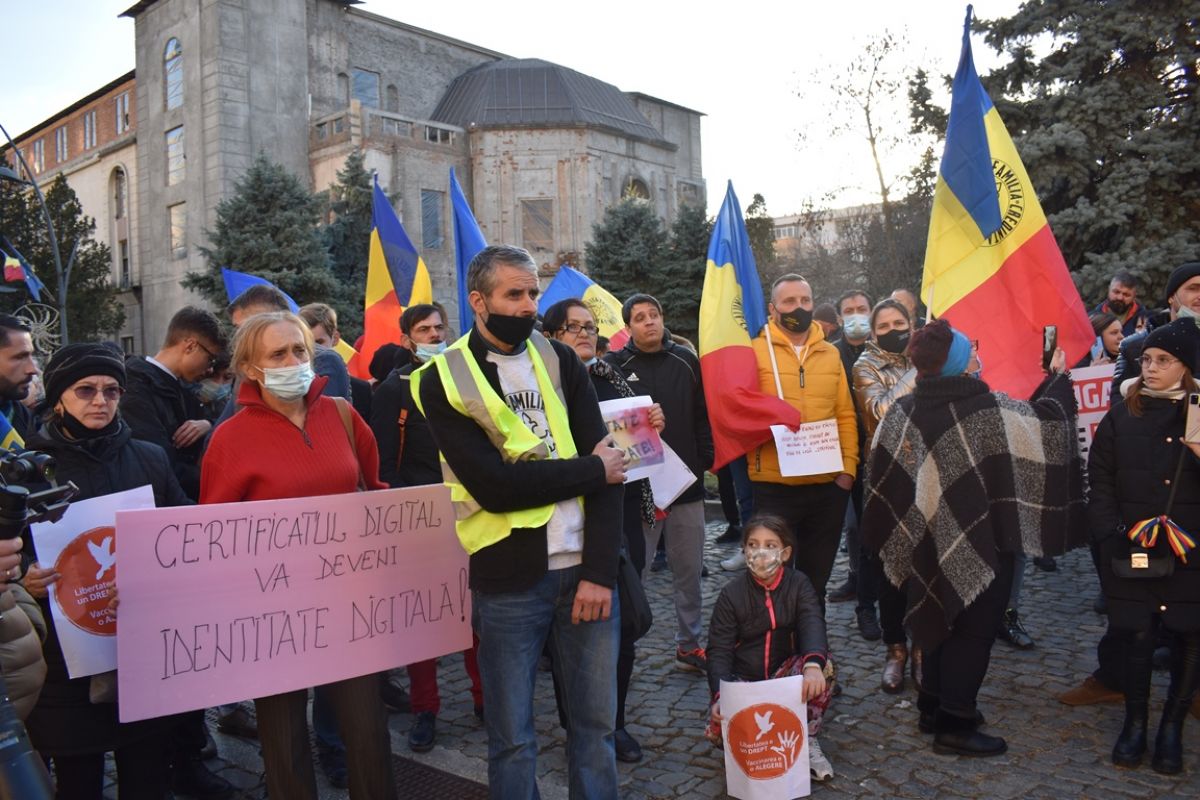 ”Nu ne vaccinăm”, ”Nu votați vaccinul”, ”Fără certificat”, ”Libertate”, s-a strigat la miting. Când s-a ajuns la ultima scandare, profesor a îndemânat să fie astfel completată: ”Libertate fără certificate”.
