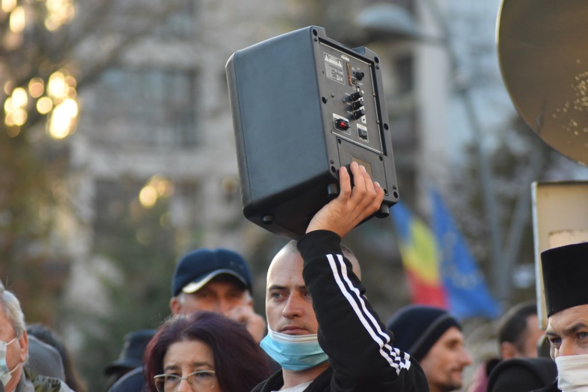 Fără mască, la un moment cadrul didactic nu și-a ascuns nemulțumirea că organizatorii mitingului de la AUR nu au pregătit ”infrastructura” necesară pentru ca discursul său să poată fi auzit mai puternic. Aceasta în condițiile în care, pentru a fi ascultat cât mai bine, unii protestatari i-au ținut pe rând deasupra capului boxa cu care profesorul se deplasase la eveniment.