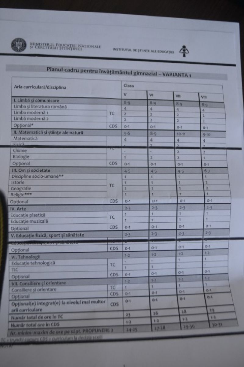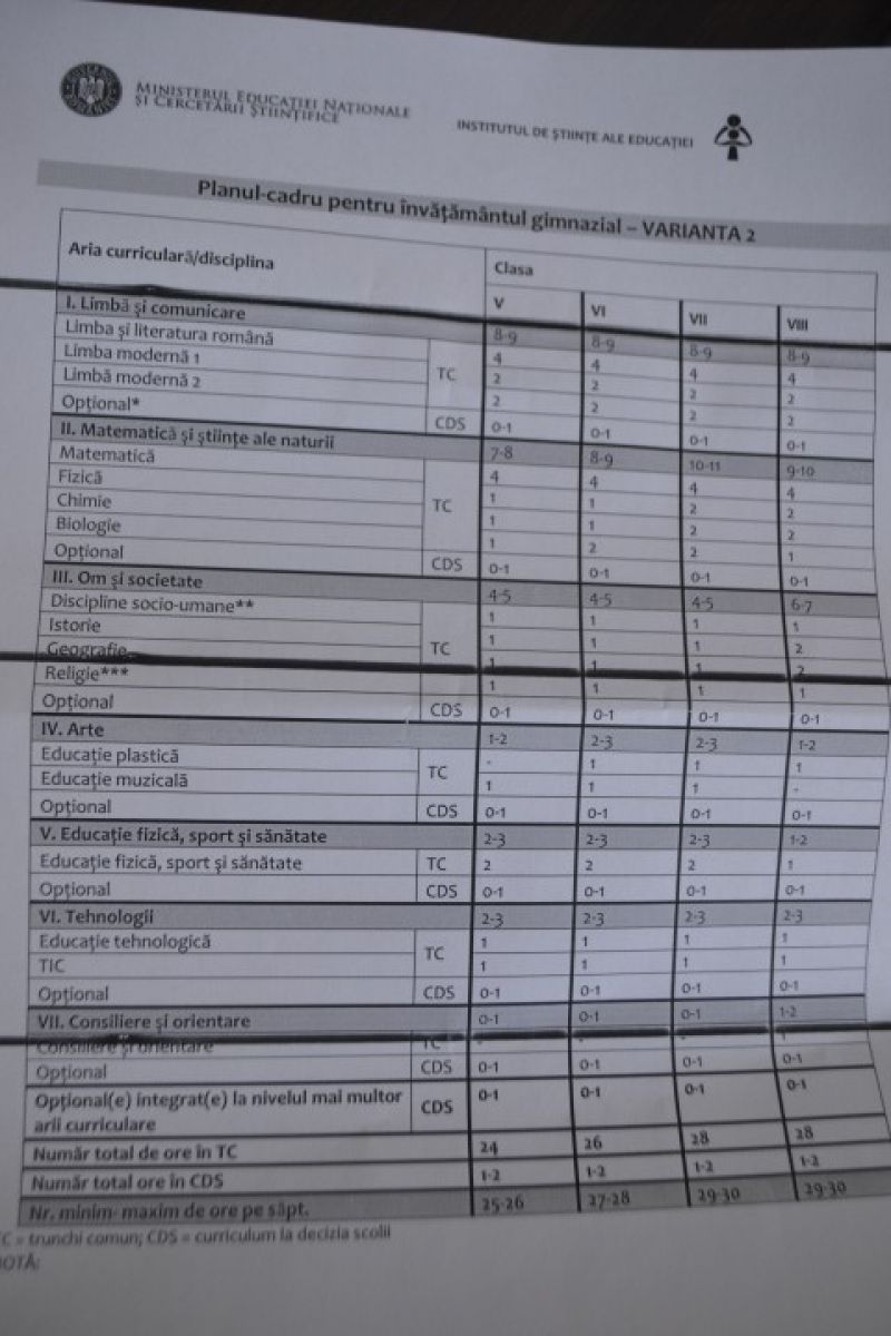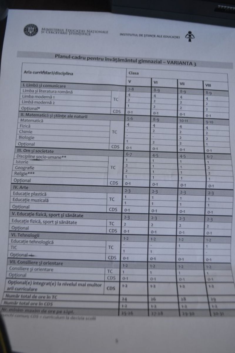 "Reducerea numărului de ore va afecta cadrele didactice care le predau. Apar ore în plus pe informatică și TIC (tehnologia informației și comunicării), iar ore în minus la disciplinele de limbă și comunicare. Sunt trei variante ale planului-cadru. Noutatea ar fi că apare TIC în gimnaziu într-a 5 a și a 6-a, iar la una dintre variante se face pe tot parcursul. Limba Latină văd ca nu mai apare în niciuna dintre variante. La Limba Română dispare o oră.